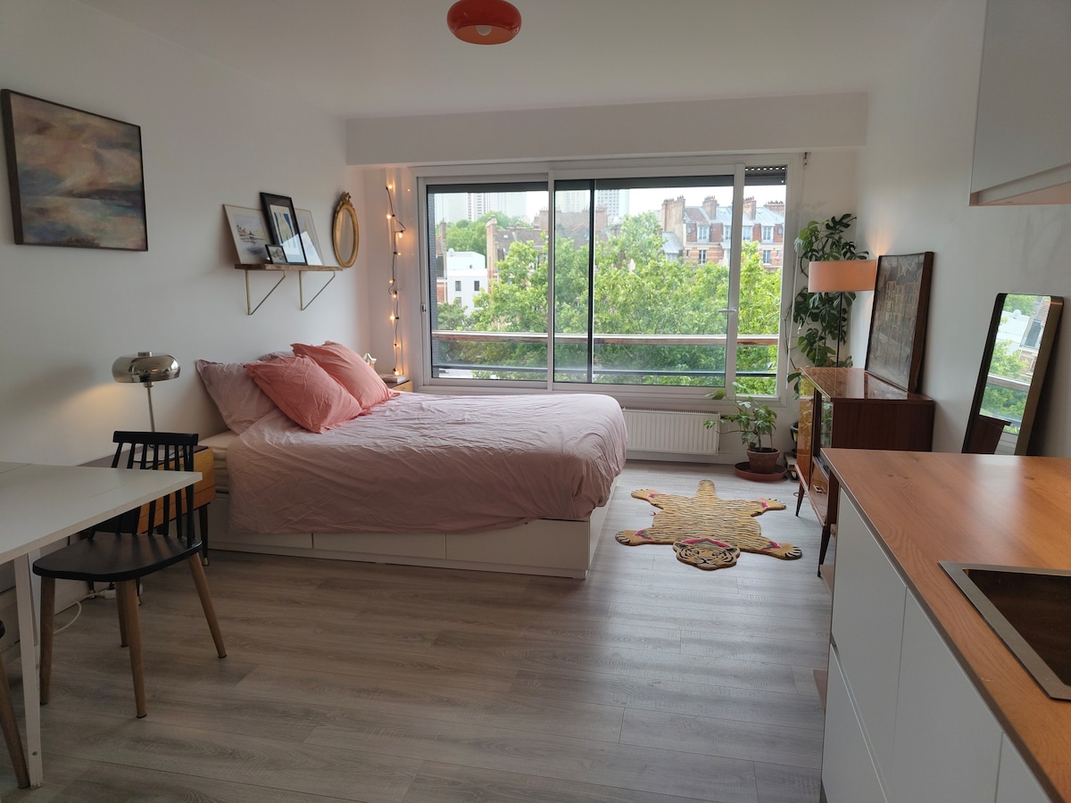 25 m² studija ar gaisa kondicionētāju Parīzē 19, netālu no Buttes-Chaumont. Ideāli piemērots 2 cilvēkiem, divguļamā gulta, aprīkota virtuve, ātrs Wi-Fi, veļasmašīna/žāvētājs. Apkaimi labi apkalpo sabiedriskais transports, un tajā ir daudz papildērtību. Jūs atradīsiet: atvērtu guļamistabu ar divguļamo gultu, viesistabu ar ēdamistabas zonu, virtuves zonu un vannasistabu ar dušu un tualeti. Studija ir aprīkota ar trauku mazgājamo mašīnu, Nespresso mašīnu un daudzām papildērtībām.