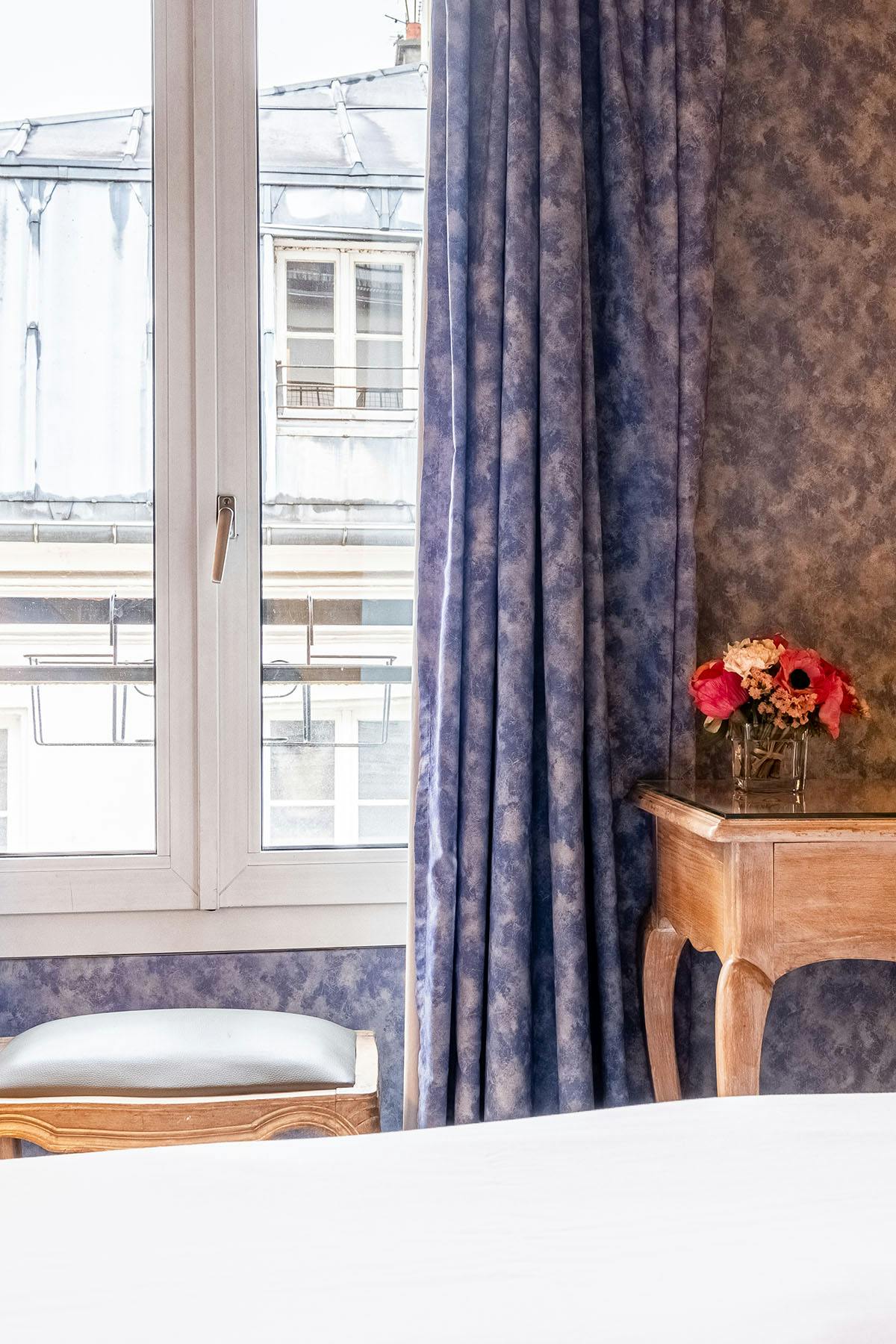 No mūsu mirdzošās 14 kvadrātmetru klases istabas paveras elpu aizraujošs skats uz Tourville avēniju. Šī burvīgā istaba, kas ir pieejama vienam līdz diviem cilvēkiem, sniegs jums komfortu un maigumu labam miegam! Skats, uzmanība detaļām, krāsu un materiālu harmonija jūs noteikti iepriecinās! Šajās istabās nav atļauta mazuļa gultiņa.