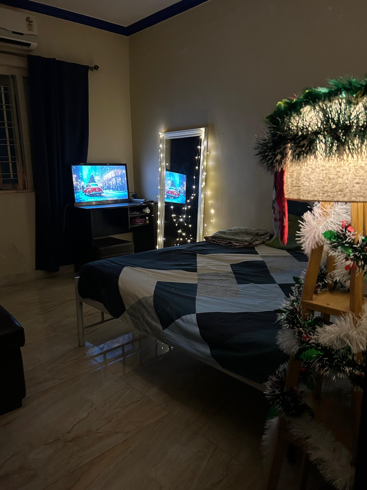 Dzīvoklis atrodas dzīvojamā ēkā zaļajā zonā. Tas piedāvā mierīgu un klusu vidi bez traucējumiem. Guļamistabā ir gaisa kondicionētājs un dažādas papildērtības, kā parādīts attēlos. Papildu iespējas ietver Wi-Fi, Smart TV, mēbelētu virtuvi ar LPG gāzi un karsto un auksto ūdeni. Dzīvoklis ir plašs un labi vēdināts. Lūdzu, ņemiet vērā, ka personu apliecinošs dokuments ir obligāts un apmeklētāji nav atļauti. Izmitināšana ir pieejama tikai Indijas pilsoņiem. Ārzemnieki nav atļauti.