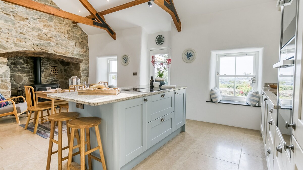 Laipni lūdzam Bryn Goleu. 3 akru platībā atrodas romantiska, mājīga, savdabīga un mājīga klēts, kas atrodas 700 pēdu augstumā Bwlch Mawr kalnā ar satriecošu skatu uz jūru un kalniem. Jums ir pilnīgs privātums bez garāmbraucošas satiksmes. Miers un klusums, savvaļas dzīvnieki un brīnišķīgas pastaigas pie jūsu durvīm. Vērojiet satriecošus saulrietus pār līci un saullēktu virs Snovdonas. Nosaukums Bryn Goleu nozīmē kalnu gaisma. Viens mazs/vidējs suns ir laipni gaidīts pēc abpusējas vienošanās, taču, lūdzu, informējiet mūs par to