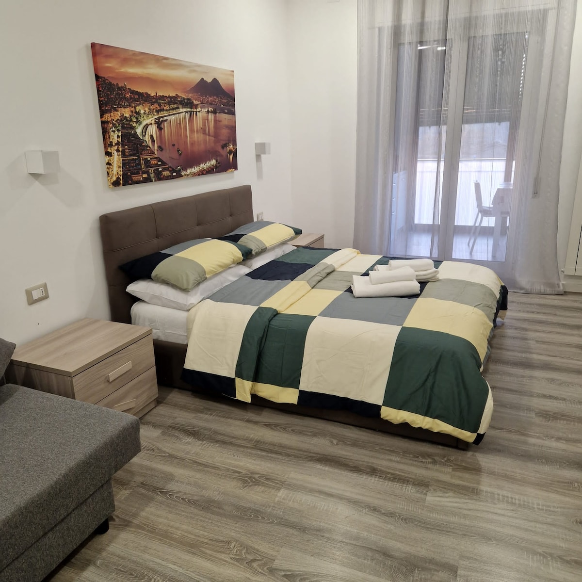 Bilocale di 40 mq situato al piano terra con accesso indipendente da terrazzino privato di circa 10 mq arredato. Dotato di camera da letto matrimoniale, bagno privato con doccia, living con angolo cottura e divano letto matrimoniale. L'appartamento è dotato di tutti i comfort: aria condizionata, tende oscuranti, smart tv, wi-fi, asciugacapelli. Questo appartamento ha un accesso facilitato, sanitari idonei a persone anziane o con difficoltà motorie, doccia con maniglione e seggiolino disabili.