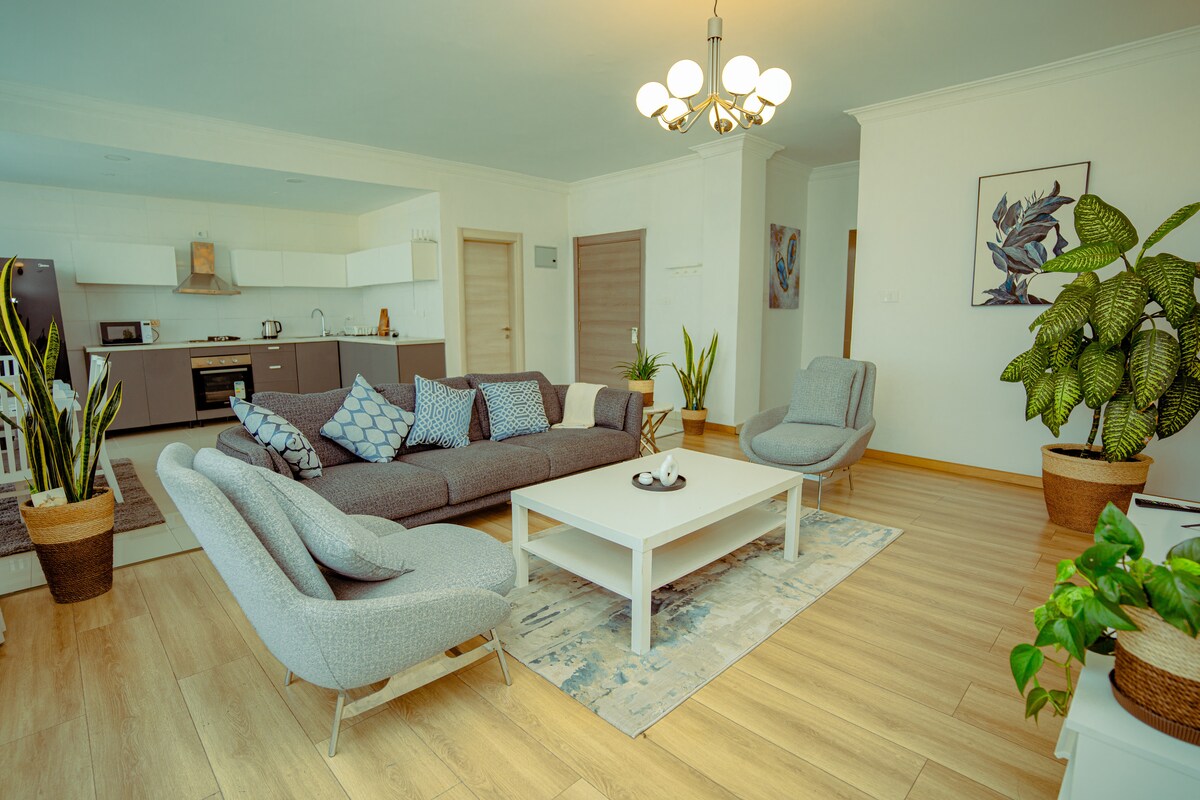 Pilnīgi jauns luksusa dzīvoklis ar PELDBASEINU, SPORTA ZĀLI un SPA uz vietas (nepieciešama atsevišķa ieejas maksa) – 15 minūšu attālumā no Bole lidostas un pilsētas centra! Izbaudiet mūsdienīgu komfortu šajā pilnībā mēbelētajā 3 guļamistabu mājoklī, kas atrodas drošā, norobežotā kopienā Noa lidostas brauciena virsotnē. Galvenajā guļamistabā ir privāts balkons, privāta vannasistaba un Smart TV ar Netflix. Izbaudiet nepārtrauktu elektrību (rezerves ģenerators), uzticamu ūdeni (privāta tvertne) un ātru Wi-Fi (pieejams papildu pārnēsājams Wi-Fi).