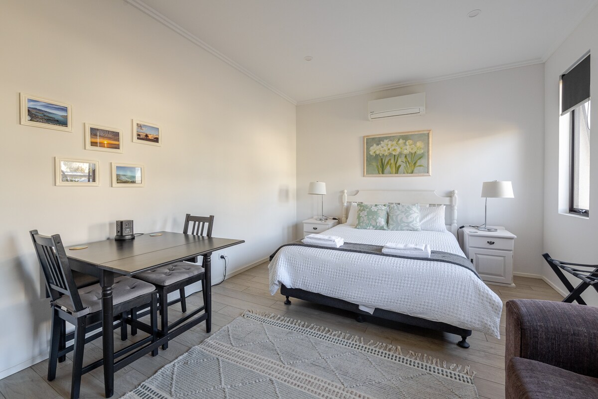 Šajā nelielajā studijā ir savs segts āra galds un krēsli jaukā dārza zonā un piekļuve ārdurvīm no priekšpagalma. Viedtelevīzija pie sienas. Skapī paslēptajā minivirtuvē ir neliels ledusskapis, mikroviļņu krāsns, tosteris, tējkanna, trauki un galda piederumi. Āra zonā atrodas arī gāzes plīts. Divguļamā gulta (Queen) un atsevišķa pastaiga garderobes zonā ir savienota ar pilna izmēra vannasistabu. Ideāli piemērots vienam cilvēkam pārim. Arī BEZMAKSAS autostāvvieta uz IELAS!
