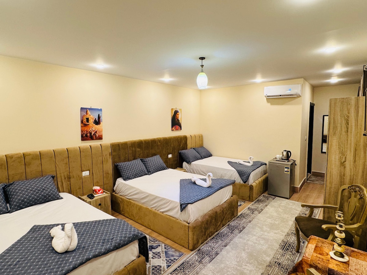 Laipni lūdzam unikālā atpūtā tikai 5 minūšu attālumā no piramīdām! No šīs studijas paveras panorāmas skats uz piramīdu un privāta burbuļvanna. Telpā ir faraonu iedvesmots dizains ar unikāliem dekoriem un arhitektūras detaļām, kas rada vēsturisku, mājīgu gaisotni. Izbaudiet divguļamo gultu, ēdamistabas zonu, minivirtuvi un privātu vannasistabu. Viesiem ir pieejams arī kopīgais jumts ar satriecošiem skatiem neaizmirstamai atpūtai.