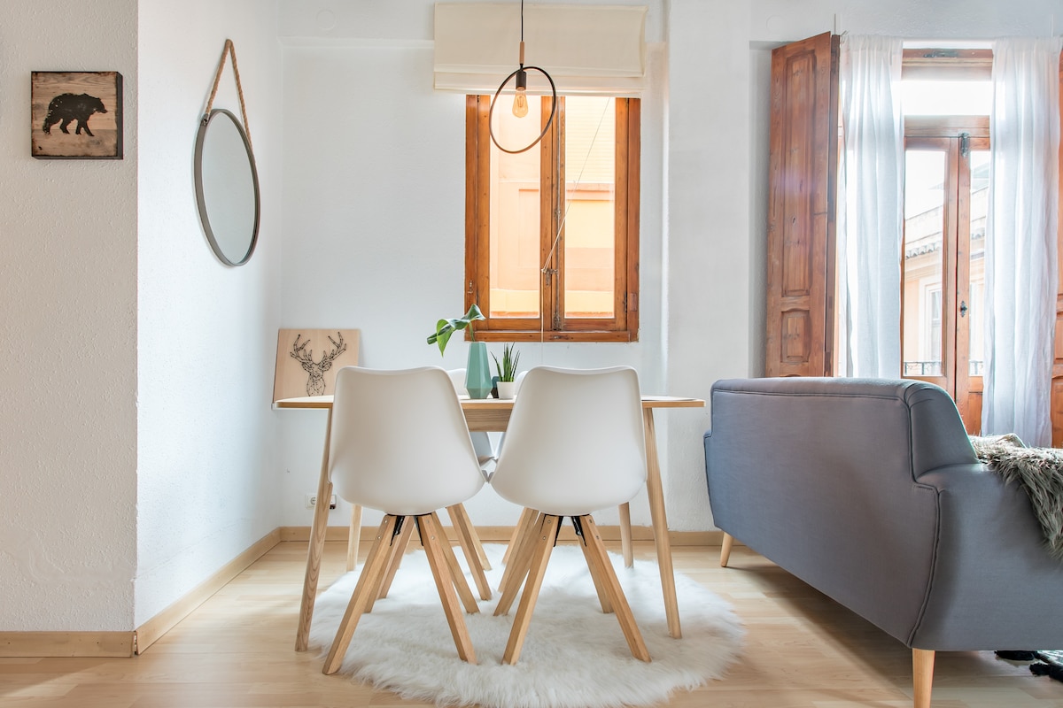 Skaists 50m2 dzīvoklis vēsturiskas un apsargājamas ēkas trešajā stāvā bez lifta. Ar augstiem griestiem un lieliem logiem, kas ļauj būt grīdai ar daudz gaismas, tas sastāv no plašas dzīvojamās istabas un integrētas virtuves, kas ir pilnībā atvērta. Dzīvojamā istabā atradīsiet televizoru ar Netflix un WIFI, kas ir ideāli piemērots atslēgšanai pēc garas dienas. Virtuve ir pilnībā aprīkota (keramikas plīts, ledusskapis, mikroviļņu krāsns, veļas mašīna), ja vēlaties ēst mājās. Tajā ir visi nepieciešamie virtuves piederumi, kā arī tosteris, kapsulu kafijas automāts, sulu spiede un tējkanna. Liela guļamistaba ar divguļamo gultu (135 cmx190 cm) un lielu vannasistabu ar dušu un visu nepieciešamo, piemēram, dvieļu komplektu, fēnu, šampūnu un vannas želeju. Ceļojumu gultiņa pēc pieprasījuma ir pieejama bez papildu maksas. Ēkai nav koplietošanas telpu. Mēs uzņemam savus viesus personīgi, mums patīk uzņemt un sniegt informāciju par dzīvokli, kā arī par pilsētu. Mēs vēlamies, lai jūtaties kā mājās! Mēs labprāt jums ieteiksim un atrisināsim visas problēmas pirms uzturēšanās un tās laikā. Kad būsiet mūsu viesis, mēs būsim pieejami, ja nepieciešams. Nekādu problēmu - informējiet mūs par savām bažām vai jebkādiem citiem jautājumiem, kurus varam atrisināt, izmantojot savu mobilo tālruni. Mēs runājam spāņu, angļu, itāļu un franču valodā. Atrodas Valensijas vēsturiskajā centrā, dažu metru attālumā no pilsētas svarīgākajiem un tūrisma objektiem, piemēram, Plaza de La Virgen (365 m), Plaza de La Reina (210 m), katedrāles (200 m), La Lonja de la Seda un Centrālā tirgus (200 m). Jūs dzīvosiet Valensijas sirdī, pilns ar dzīvi un kustību, jūs varat baudīt pilsētas šarmu, tās ielas, tās pieminekļus un tās dzīvespriecīgu dzīvi. Lieliskā atrašanās vieta ļauj mums būt labi savienotiem, visi pārvadājumi iet caur Plaza de La Reina, kur viņi mūs ved, piemēram, uz Zinātņu un mākslas pilsētu vai uz Valensijas pludmali. Nūjošana vai riteņbraukšana ir lielisks variants, jo viss atrodas tuvu grīdai. Ja jūs ierodaties ar automašīnu, tikai 200m attālumā atrodas La Plaza de la Reina publiskā autostāvvieta pilsētas sirdī. Kluss un tajā pašā laikā jūs atradīsiet visu vitalitāti pilsētas. Mēs būsim priecīgi Jūs konsultēt.