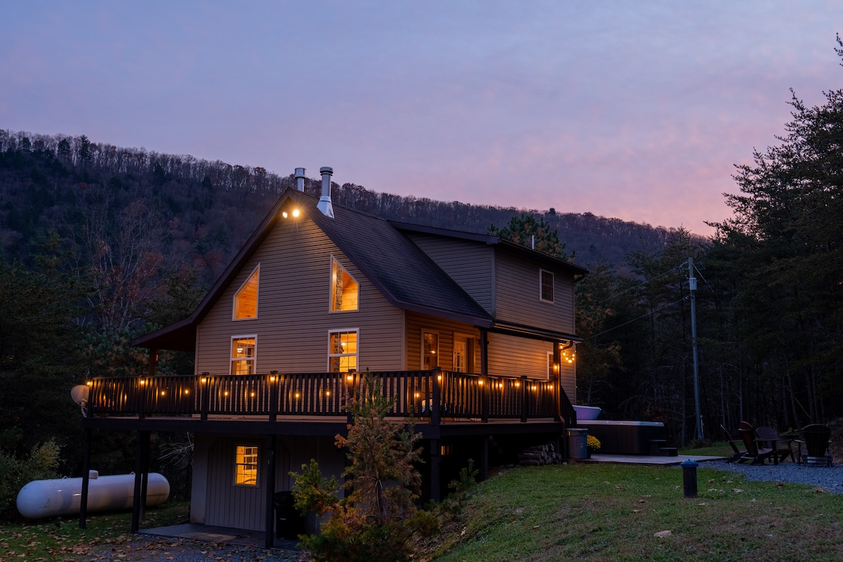 Dziļi PA Wilds sirdī jūs gaida mierīga un skaista atpūtas vieta. Laipni lūdzam Alpu mājoklī, kur satiekas daba un papildērtības, lai sniegtu jums gaidīto atvaļinājuma pieredzi, ar panorāmas logiem, kas sniedz skaistu skatu, kas stiepjas jūdžu un jūdžu garumā, atvērtu stāvu plānu, mājīgu divguļamo gultu, vannu un privātu terasi ar burbuļvannu. Šis būs mājoklis, ko neaizmirsīsiet! - Karstā vanna - Ir ugunskura koksne - Veļas mazgātava - Skaisti skati! - Burbuļvanna - Lieliski pārgājieni tuvumā!
