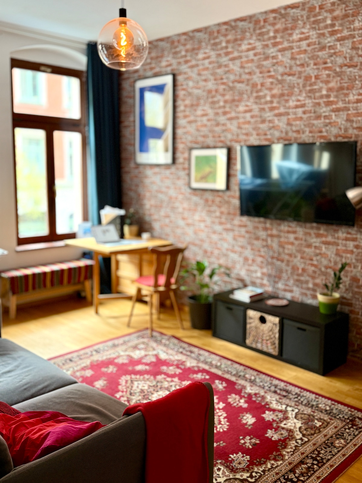 Mūsu jaukajā dzīvoklī ir milzīga viesistaba, istaba ar divguļamo gultu un bērnu gultiņu un otra guļamistaba ar divguļamo gultu un vienguļamo gultu. Mūsu virtuve ir augstas kvalitātes un moderna ar visām papildērtībām. Teritorija atrodas diezgan, bet ļoti tuvu pilsētas centram, vai nu ar tramvaju (10 min), vai jauku pastaigu pa Elbas upi (30 min). Maiznīca, pārtikas veikals un rotaļu laukumi atrodas pavisam netālu. Mums pagalmā ir batuts. Dzīvoklis ir ideāli piemērots pārim vai ģimenei ar (maziem) bērniem.