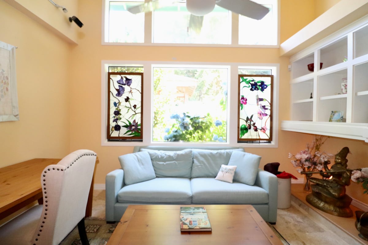 This lovely guest house is located in the quiet neighborhood of center Bellevue and includes all the necessities for a short vacation: beautiful garden view on the bed side, great privacy with no shared walls with main building, full kitchen for home cooking, cute pet bunnies in the garden, etc. Convenient location: walking distance to grocery store and restaurants, or <4 miles to beach parks, botanical garden, farm parks. Bus access to Microsoft campus, Washinton U, or downtown Seattle.