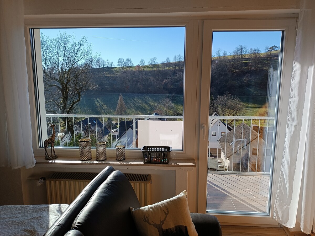 Atpūtieties un atpūtieties... Mūsu vienistabas dzīvoklis tika izveidots tikai no dabiskiem celtniecības materiāliem. Ar lielu mīlestību pret detaļām šeit esmu apstrādājis dabisko šīferi un ozolkoka koksni. Augstas kvalitātes interjers aicina atpūsties. Šeit pie vārtiem uz Vogelsbergu ir ieeja kalnu velosipēdu takā "Mühlental". Velosipēdu uzlādes stacija tieši dzīvoklī. Pēc tam - pirts? Ja ir interese, ir iespēja apgriezties ar maniem ASV vecajiem;-)