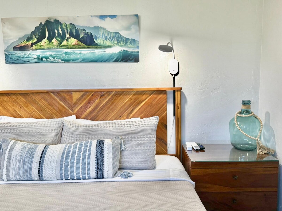 🌺 Laipni lūdzam mierīgajā Kauai oāzē, kas ir pārpildīta ar papildērtībām! ☀️ Gaismas piepildīts mājoklis apvieno modernu komfortu ar Kauai dabas skaistumu. 🌿 Pārdomāti veidots ar priecīgu mākslu un augstākās klases mēbelēm. ✅ JAUNS stilīgs pārveidojums ✅ JAUNS gaisa kondicionētājs katrā istabā ✅ 8 min līdz Hanalei ✅ Divguļamā gulta (King). ✅ Ērts dīvāns ar divguļamo gultu (1-2 guļamistabas) ✅ Pilnībā aprīkota virtuve ✅ Vienībā esoša veļas mazgātava + žāvētājs ✅ Ātrs Wi-Fi + darba vieta ✅ Pludmales + snorkelēšanas aprīkojums ✅ Viedtelevizori ✅ Piekļuve baseinam, burbuļvannai un bārbekjū ✅ Bezmaksas, rezervēta autostāvvieta