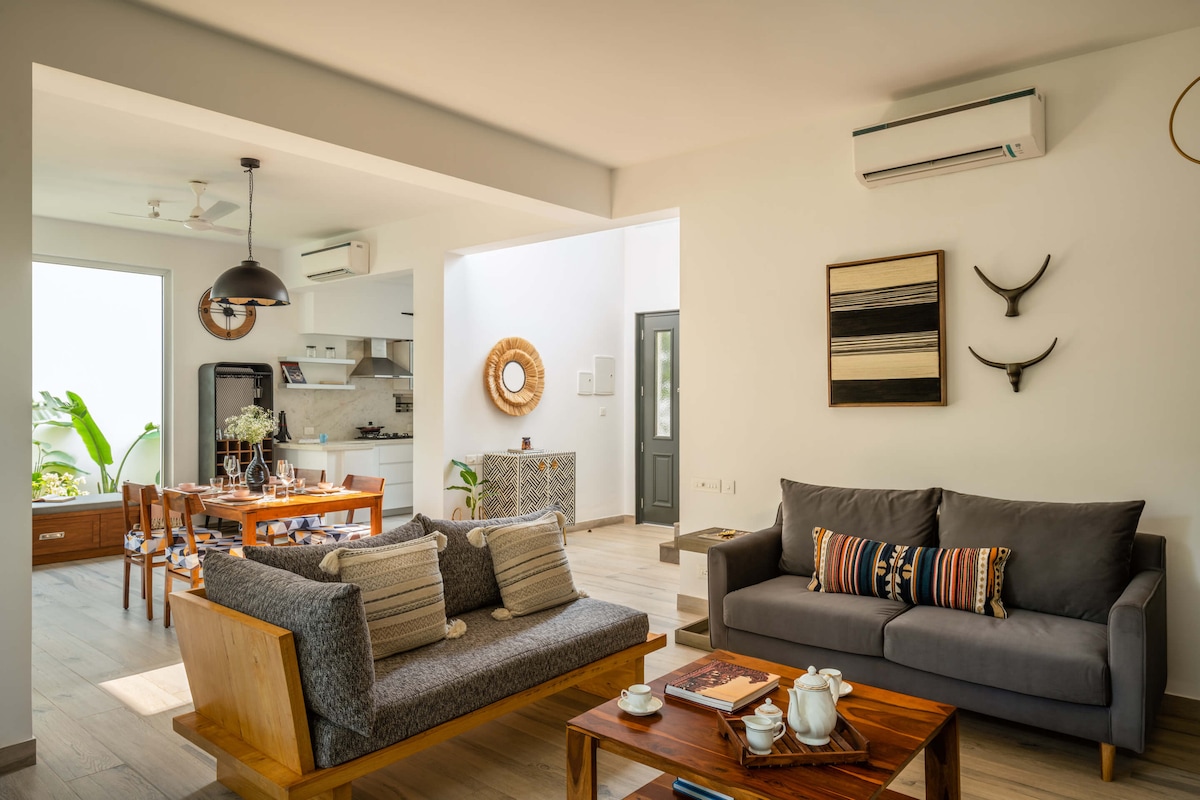Nestled in the lush hills of Vadi, Siolim, Mocha is a spacious 1 BHK designed for comfort. With glass windows overlooking greenery, a cozy bedroom, en-suite bathroom, and a living room with a sofa-cum-bed & projector for OTT movie nights, Mocha is the perfect blend of style and relaxation. The cafe-inspired nook, with a work/dining table, makes it ideal for staycations. Explore Siolim's cafes bars, with Anjuna, Vagator, Assagao & Morjim, Mandrem beaches 15-20 min away & 35 min from MOPA airport.