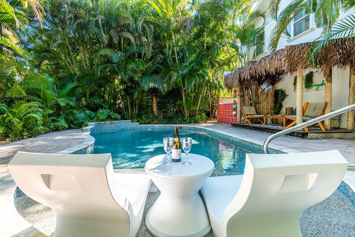 Back Open Jan '25! Located just 200 steps from the beach you’ll have your feet in the sand in no time. A comfortable living area + fully equipped kitchen. Furnished with island décor and local art. Everything you need including a heated pool, large patio with a Tiki hut, tropical gardens, plus a private outdoor area with a shower for your comfort. Walk to everything – grocery, pharmacy, ice cream, breakfast, pizza, donuts, and the beach which is less than 2 minutes away.