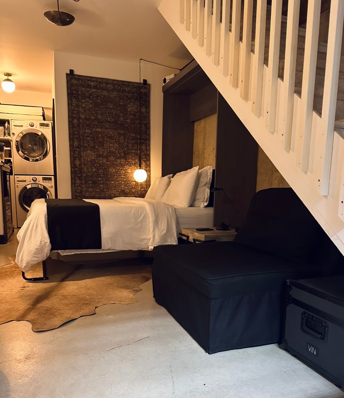 Šis ir plašs jaunuzceltā mājokļa zemākais līmenis. Šajā privātajā viesu zonā ir atpūtas telpa, ēdamistaba un virtuvīte, kā arī guļamistaba un vannasistaba. Viesiem ir pieejama tikai galvenā ieeja pilsētā ar īpašniekiem, kuri dzīvo augšstāvā. Šajā privātajā, dekorētajā telpā ir viedais televizors, ērtas sēdvietas, ēdamistaba 4 personām, mikroviļņu krāsns, kafijas automāts, pilns ledusskapis, tosteris/gaisa fritieris, divguļamā gulta, drēbju skapis un kumode. Veļas mazgājamā mašīna/žāvētājs ir pieejams pēc pieprasījuma. Pirms rezervācijas, lūdzu, pārskatiet mājokļa noteikumus