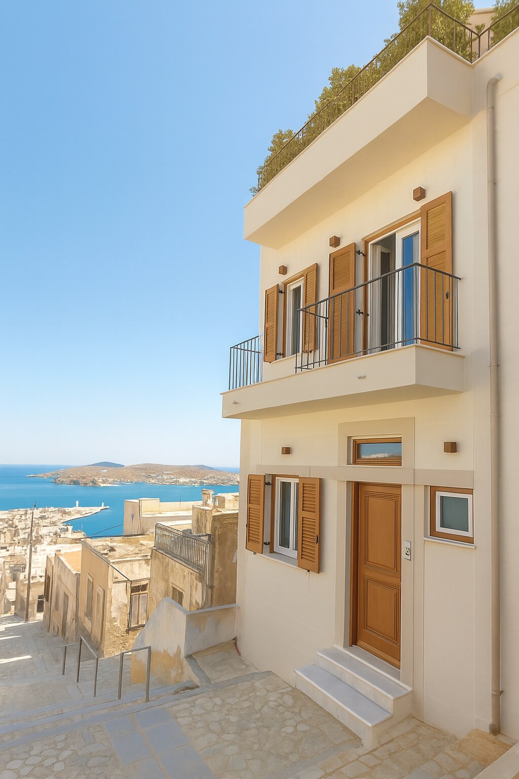 1870. gada neoklasicisma pilsētas māja atrodas pašā Ermoupolisas sirdī. Viss otrais stāvs, kas saglabāts mūsu viesiem, ir plašs un saulains numurs ar iespaidīgu skatu uz pilsētu un Egejas jūru. Tā sastāv no 2 guļamistabām, 1 vannasistabas, viesistabas ar piekļuvi balkonam un virtuvei. Trešajā stāvā atrodas milzīga terase. Telpas ir ideāli piemērotas ģimenēm, pāriem vai draugu grupai, un viss atrodas ļoti īsas pastaigas attālumā.