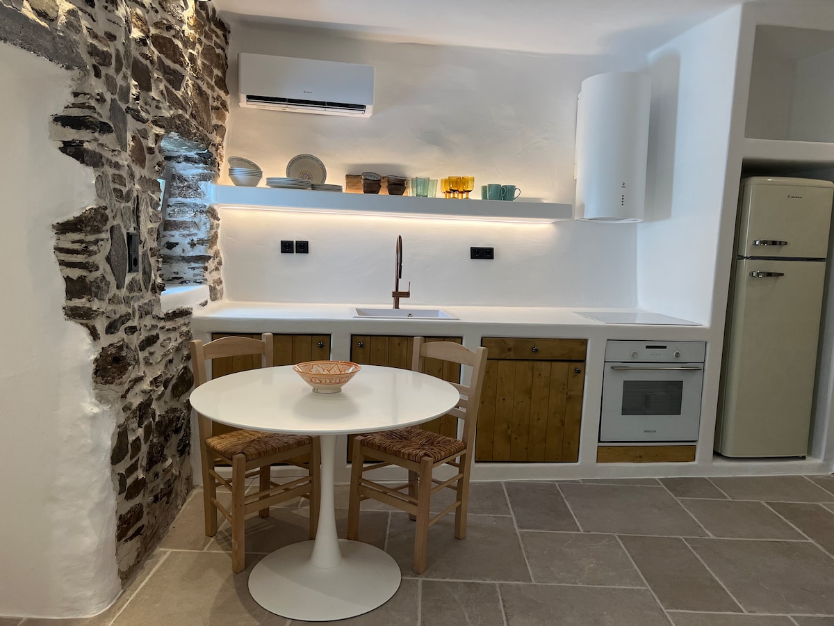 It is my pleasure to have the chance to host you in my tradiotional house at Kythnos island. The very house is located exactly on the centre of the island, a few metres outside of the traditional village Dryopida. For instance, this acommodation is 8km far of the port Merichas, 6km from the capital (Chora), while the closest beach is 3km far (Lefkes).