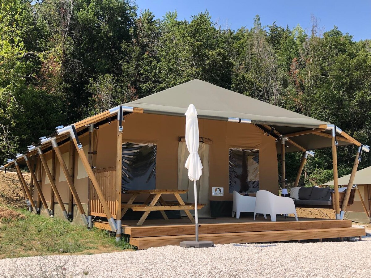 No mūsu plašās safari telts paveras lielisks skats uz mūsu ieleju, un saskaņā ar "Glempinga" principu ir pilnībā aprīkota ar savām sanitārajām telpām, pilnībā aprīkotu virtuvi, 3 guļamistabām un ne mazāk kā 50 m2 dzīvojamās platības! No safari telts varat doties pastaigā pa olīvu birzi uz mūsu dārzu un izmantot mūsu peldbaseinu un visas pārējās mūsu īpašumā esošās telpas. Mēs atrodamies Le Marche reģionā netālu no gleznainās Treijas pilsētas.