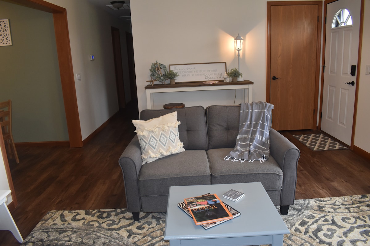 Neatkarīgi no tā, vai meklējat vietu, kur kādu laiku pavadīt vai vienkārši šķērsot, mēs domājam, ka jums šeit tas šķitīs diezgan jauki. Mēs atrodamies tikai 5 jūdžu attālumā no I70 un atrodamies starp daudzām apskates vietām. Dodieties ārā vai palieciet iekšā. Āra dzīvojamā telpa ir diezgan iespaidīga! Privāts, ar burbuļvannu, ugunskura vietu (ar malku), kūdra, kur spēlēt kukurūzas caurumu. Iekšpusē ir visas mājas ērtības ar pilnu virtuvi, veļas mazgātavu, darba vietu un mājīgu kamīnu.
