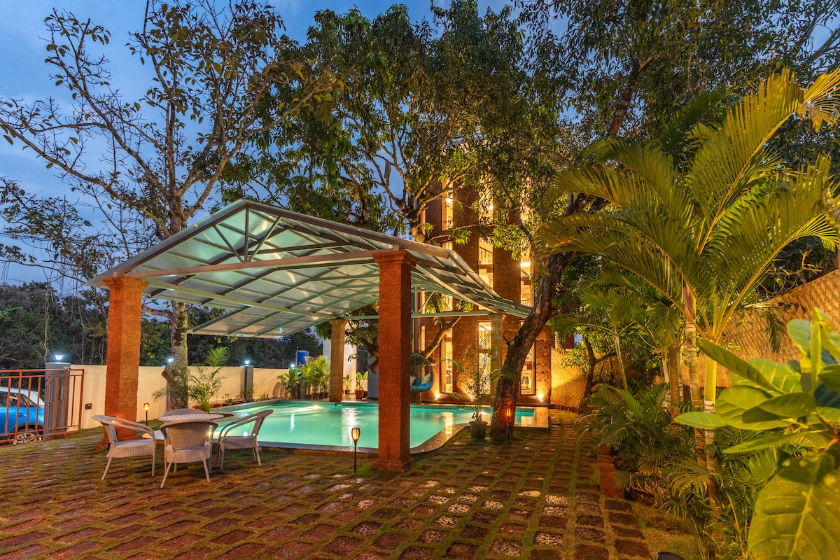 Ir 3 BHK grezna villa (Alorna 403503), 10 km attālumā no MOPA lidostas, kas atrodas mežainā apvidū un pieskaroties Chapora upei. Villai ir gaisīga zīmēšanas/ ēdamistabas zona, kas atveras uz dārzu pirmajā stāvā, un otrajā stāvā ir WFH telpa. Privāts peldbaseins ar bezgalības egde uz upi, ar lapenes zonu. Elpu aizraujošs skats uz upi no 2 guļamistabām. Generator backup & Caretaker. Noma ietver ēdiena gatavošanas pakalpojumus maltītēm. Sastāvdaļas pēc jūsu izvēles, par maksu papildus, faktiskajā cenā.