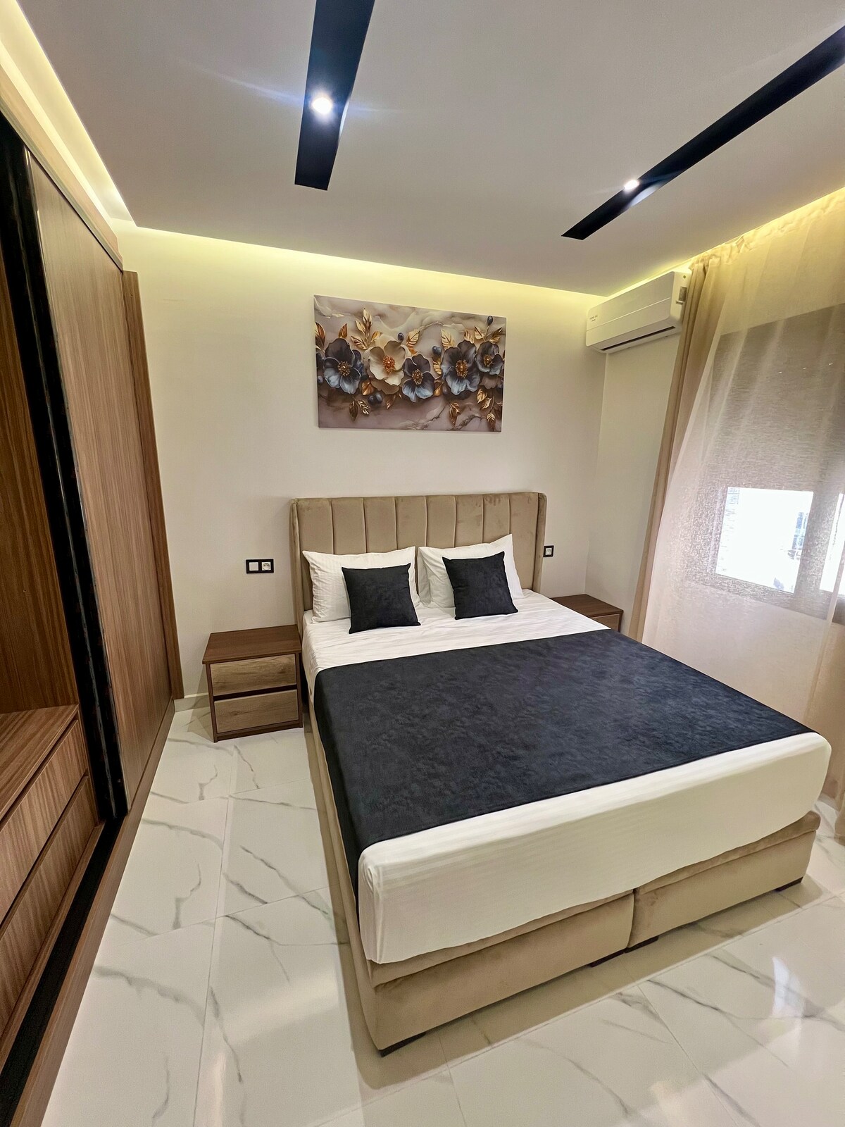 Dzīvoklis sastāv no 2 guļamistabām netālu no visiem apskates objektiem un papildērtībām. - 3 minūšu gājiena attālumā no pludmales. - 1 minūtes gājiena attālumā no karnīzes. -10 minūšu gājiena attālumā no TGV stacijas un City Mall Tangier. - Ēka ir droša visu diennakti bez brīvdienām(kamera pie ieejas un konsjeržs) . Bezmaksas autostāvvieta ir pieejama uz vietas. - Baseins ārpus ēkas atrodas 5 minūšu gājiena attālumā. - Baseins ir atvērts jūlijā un augustā. - Baseins pieejams visiem. Bezmaksas peldēšana 4 personām, pēc tam 40 DH/papildu pers.