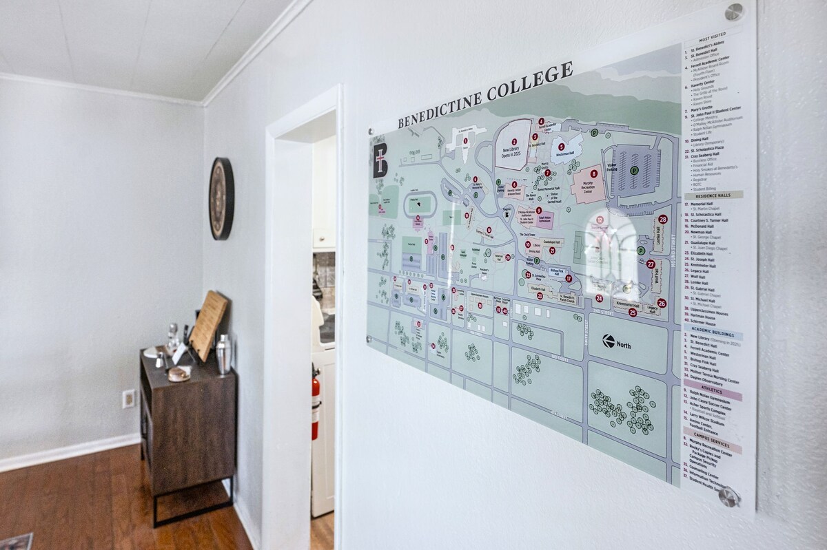 Izbaudiet benediktīniešu koledžas garu, uzturoties šajā skaisti iekārtotajā benediktīniešu koledžas dzīvoklī Atčisonā, Kanzasā! Šī telpa, kas ir ideāli piemērota absolventiem, topošajiem studentiem, ģimenēm un koledžas sporta faniem, apvieno modernu komfortu ar Kraukļa lepnumu. Šis dzīvoklis, kas atrodas netālu no Benediktīniešu koledžas pilsētiņas, Atčisonas centra un vietējiem apskates objektiem, ir jūsu ideālā mājas bāze visu, lai apmeklētu vai godinātu benediktīnus.