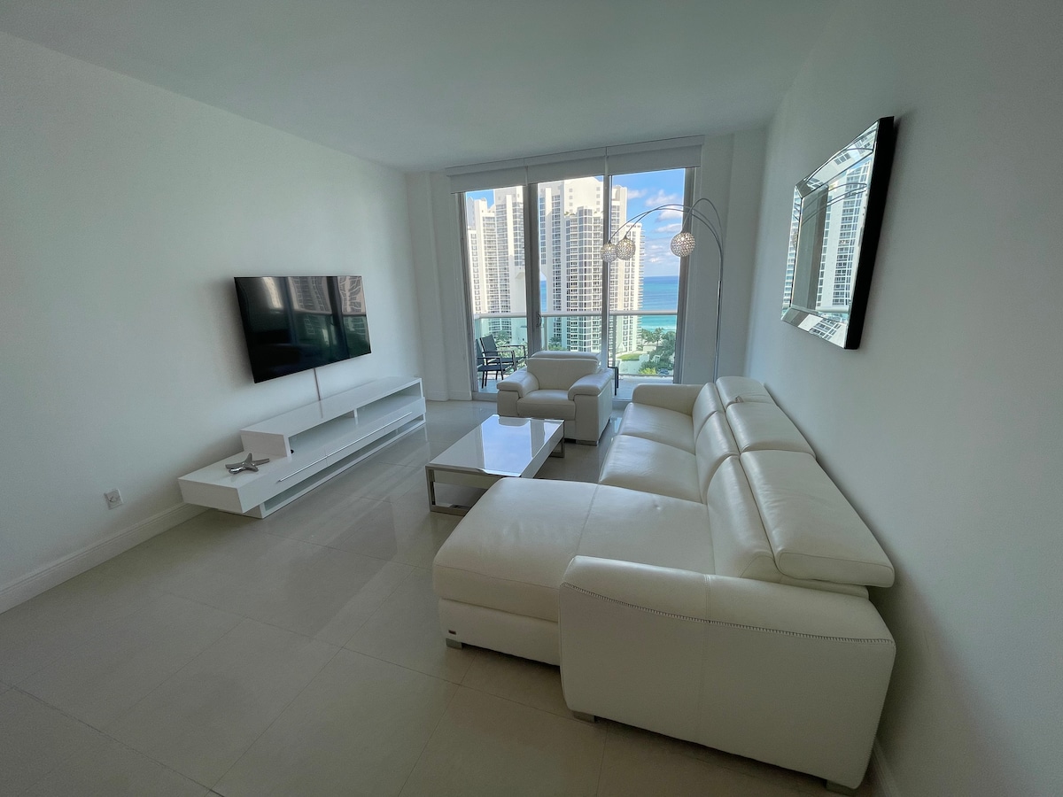Moderns 1 guļamistaba, 1 vannasistaba, 1 tualete, dzīvojamā istaba, ēdamistaba , virtuve un balkons ar lielisku skatu uz starpribu, kas atrodas Ocean Reserve daudzdzīvokļu namā (19370 Collins Ave, Sunny Isles Beach, FL) metru attālumā no pludmales un 5 minūšu attālumā no tirdzniecības centra Aventura. Šajā ērtajā dzīvoklī (aptuveni 1000 kvadrātpēdu) ir viss, kas nepieciešams jūsu ērtai dzīvošanai. Tā ir pilnībā mēbelēta un aprīkota ne vairāk kā 3 cilvēkiem.