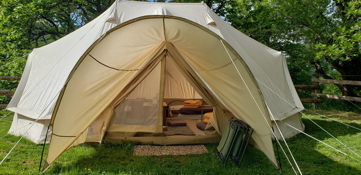 Atgūstiet saikni ar dabu šajā neaizmirstamajā ceļojumā. Izbaudiet svētlaimīgas gultas greznību dabas klusumā. Divas teltis atrodas pļavā ielejā ar skatu uz klinšu veidojumiem. Atsvaidzinošā upe atrodas dažu desmitu metru attālumā. Katrā teltī ir privāta (sausa)tualete. Kā arī plaša āra virtuve ar visām papildērtībām 80 m gājiena attālumā. Netālu no teltīm ir jauka āra duša ar izlietni. Autostāvvieta pie teltīm. Sveicināti!