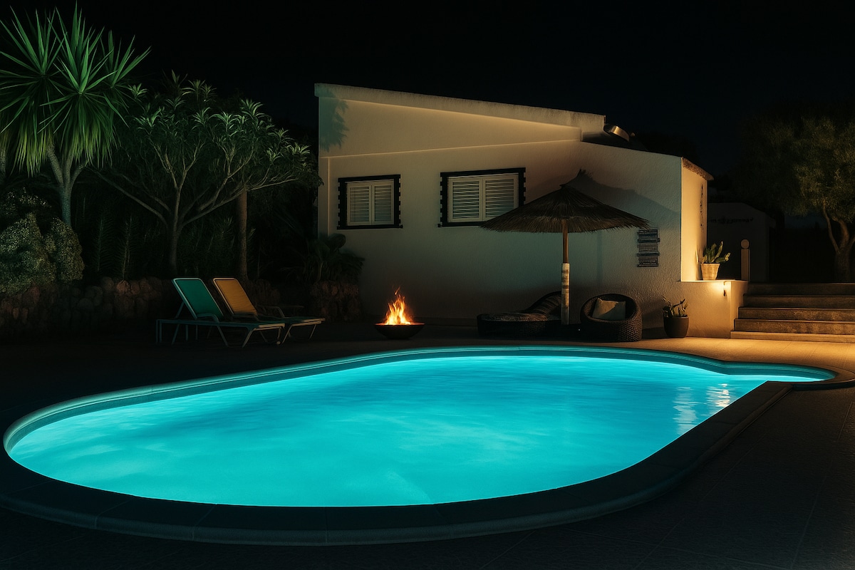 O azul é composto por uma sala com mini-cozinha equipada, sofá cama duplo, TV, Wi-Fi, ar condicionado, 1 quarto com cama de casal e 1 casa de banho. Acomodação máxima de 4 pessoas. Jardim com piscina, churrasqueira, espreguiçadeiras, redes de baloiço, zonas para as refeições no jardim e dois pequenos lagos. Não é possível trazer animais de estimação. ATENÇÃO: TEMOS 7 GATOS. O jardim e a piscina, são partilhados pelos dois alojamentos. O jardim possui 2 câmaras de vigilância.