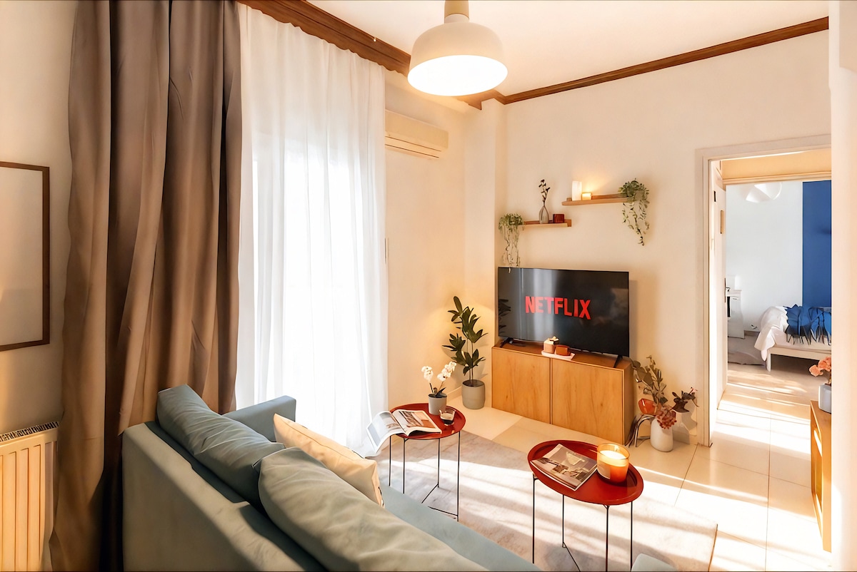 Unwind in this bright airy 65m2 apartment with soaring ceilings. Discover a peaceful 3 spaces escape right in the center city, next to Aristotelous square. Port, museums, restaurants, coffee shops, supermarkets are within walking distance! Enjoy our wifi Fiber Optic 100Mbps speed. Two aircondition units warm up the entire apartment and create a homely ambience to relax after a day visiting city sights.
