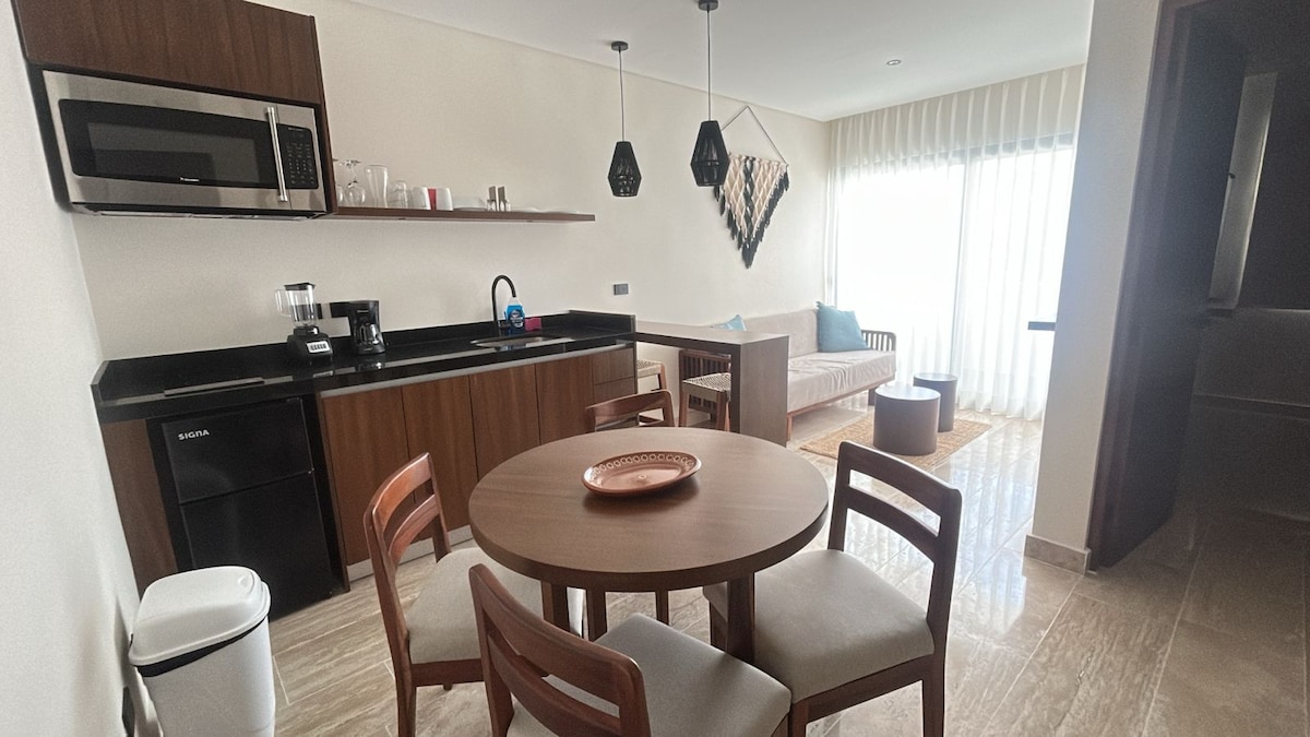 Izbaudiet Bacalar burvību mūsu skaistajā, pilnībā aprīkotajā dzīvoklī un iekārtotajā mūsdienu tropu stilā. Tajā ir 1 istaba, karaļa izmēra gulta, viesistaba ar dīvāngultu, privāta terase, ēdamistaba, vannasistaba, virtuve, A/A, 2 smartTV 50", ātrs Wi-Fi. Piekļuve jumtam, kur ir liels baseins ar iespaidīgu skatu uz lagūnu un džungļiem. Pašlaik Maijas vilciena būvniecības dēļ uz ceļa ir neliels troksnis. Ja tas ir viegls gulētājs, viņi to var pamanīt.
