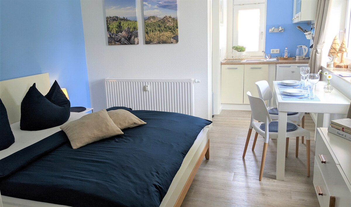 Dzīvoklis ģimenes mājas pirmajā stāvā atrodas tieši Harz pakājē, starp Wernigerode un Ilsenburg pilsētām Drībekas mazpilsētā. Atrodoties tieši mežā, jūs varat doties pārgājienā no dzīvokļa pa daudziem maršrutiem uz Harz kalniem vai sākt ar kalnu velosipēdu. Autoceļš (A36) padara šo vietu par ideālu sākumpunktu ekskursijām visā Harz reģionā, kā arī Harz ziemeļu pakājē. Dzīvoklī ir aptuveni 60 m², un tas var uzņemt līdz 4 personām.