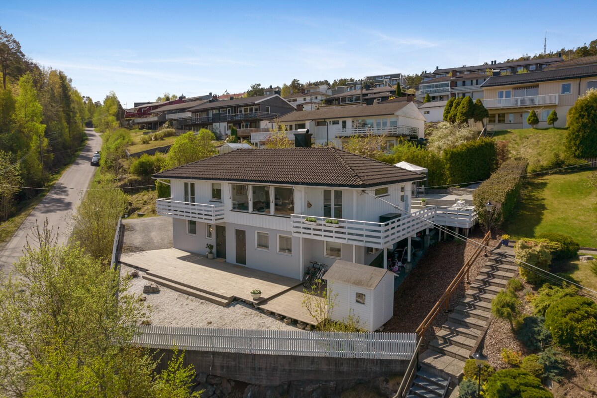 Atpūtieties kopā ar visu ģimeni šajā mierīgajā mājoklī ar panorāmas skatu uz fjordu, pastaigas attālumā līdz darījumu braucienam, vakariņām un līdz jūrai ar peldvietu. 1. stāvā ir liels dzīvoklis, savas kāpnes un ieeja, 91 kvadrātmetrs, 3 guļamistabas, dzīvojamā istaba ar guļamistabas dīvānu un 3 ādas krēsliem, kamīns cepeškrāsnī, apkures sūknis. Vannasistabā ir viesu nams, dušas kabīne, veļas mašīna un veļas žāvētājs, apvienotā izlietne un žāvētājs, virtuve un neliela istaba blakus, bezmaksas autostāvvieta. Smēķēt atļauts tikai ārpus telpām.