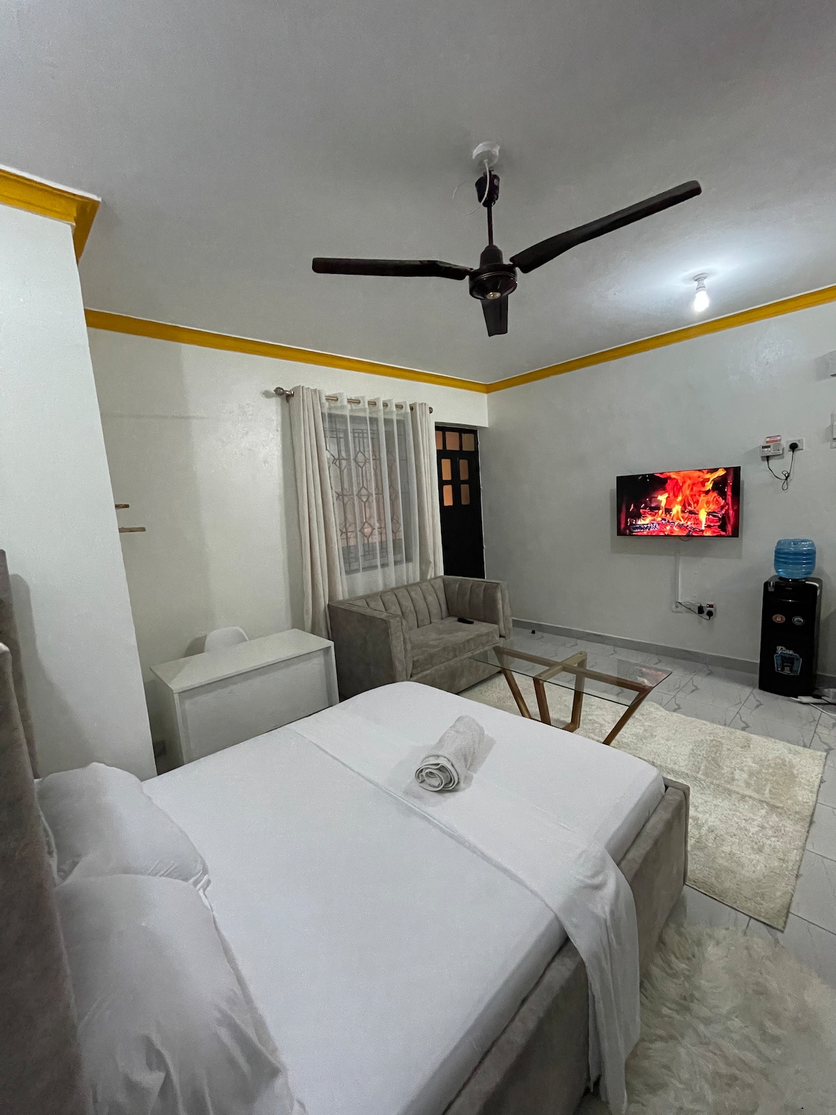 Enjoy a peaceful experience at this centrally-located place in Bamburi Mombasa just 7 mins drive to the beach and easily accessible using a Tuk Tuk. Close to shopping centres like Nyali Mall and City Mall. We have furnished the place with love for your comfort. Next to TNL Hotel. Access the hotel’s swimming pool at only Ksh 500 per adults and Ksh 300 per child.