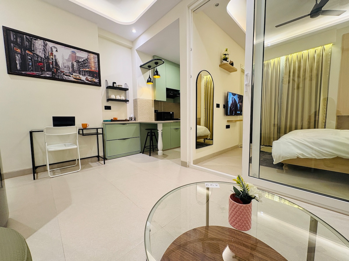 Premium 1BHK dienesta dzīvoklis 43. sektorā, Gurgaonā ar gaisa kondicionētāju viesistabā un guļamistabā, kā arī minivirtuve ar indukciju, mikroviļņu krāsni un galda piederumiem. Īstā rajonā, pastaigas attālumā no Gold Souk Mall & Shalom Hills skolas, 2,2 km attālumā no Tūkstošgades pilsētas centra metro un 2,1 km attālumā no Fortis slimnīcas. Ārvalstu viesi ir laipni gaidīti. Agrīna reģistrēšanās būs atkarīga no pieejamības, un par to būs jāmaksā 500 Rs, kā arī par novēlotu izrakstīšanos, un pēc tam par katrām 3 stundām tiks pievienoti 500 ₹.