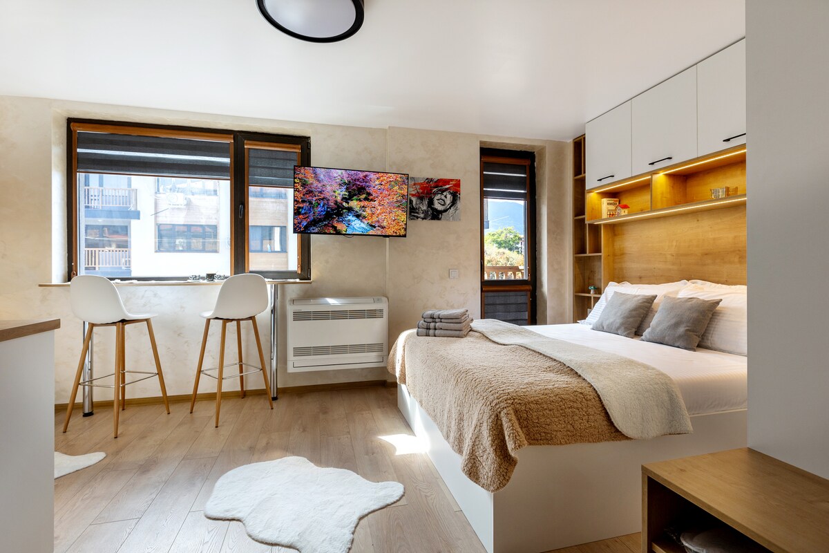 Laipni lūdzam mūsu jaunajā luksusa dzīvoklī Bansko, kas atrodas elpu aizraujošajā Pirinas kalnu grēdā. Ienirstiet unikālā alu iedvesmotā atpūtas vietā, ko rotā lauku akmeņi un silti koka akcenti. Divguļamā gulta sola maksimālu komfortu, savukārt slēptās LED gaismas rada maģisku gaisotni. Izbaudiet nevainojamu dabas un bagātības apvienojumu, no kura paveras panorāmas skats uz Bansko slēpošanas kūrortu. Jūsu atpūta kalnos gaida, kur katra detaļa čukst klusumu un eleganci