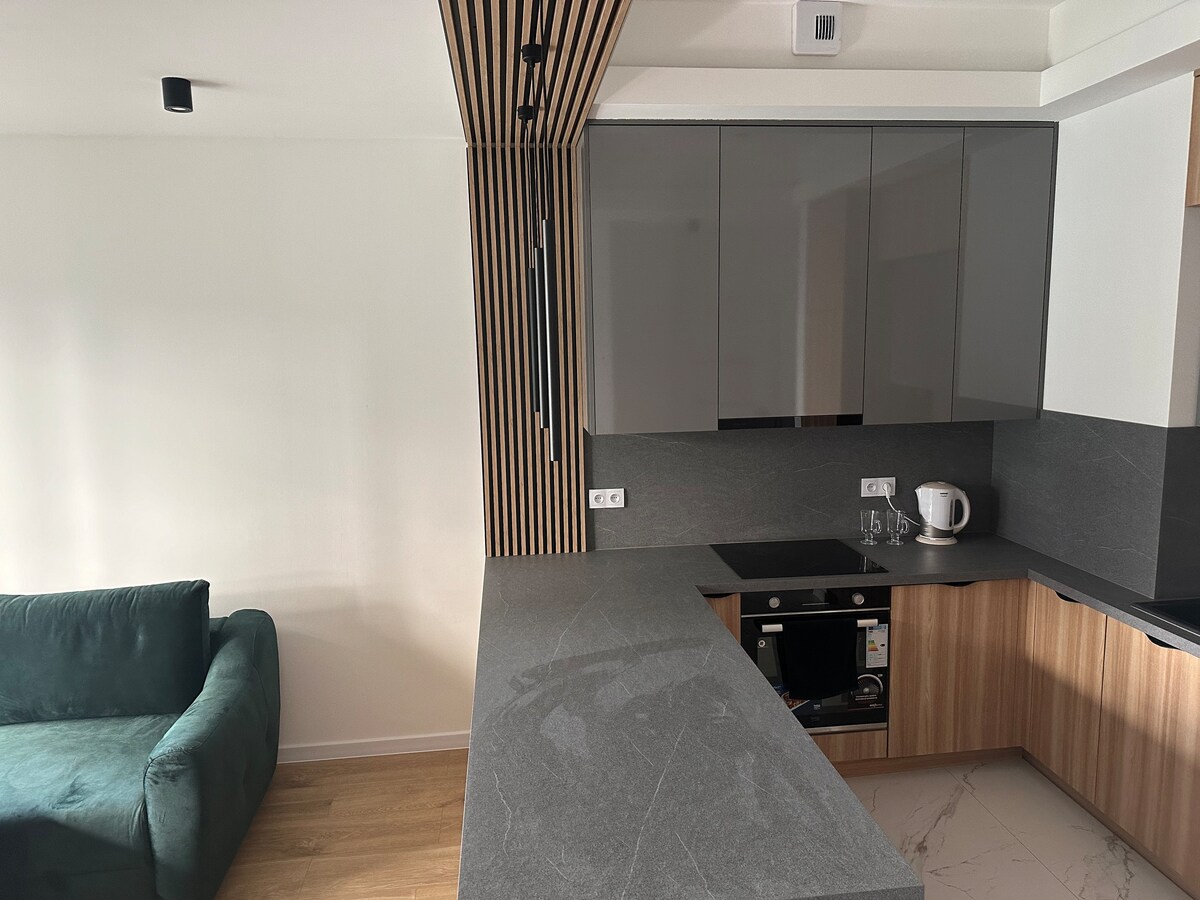 Skaists jauns dzīvoklis pilsētas zaļajā zonā ar oriģināliem dizaina priekšmetiem un ērtiem apstākļiem. Dizainera 19 m2 studijas tipa dzīvoklī ir atsevišķa guļamistaba , plaša vannasistaba, liela terase ar skatu uz apstādījumiem un bezmaksas pazemes autostāvvieta. Jūsu ērtībai - Netflix, VIEDTELEVĪZIJA, Wi-Fi - Uzkopšana ar gultasveļu un dvieļiem uzturēšanās laikā - Bezkontakta reģistrēšanās - Augstākie higiēnas , privātuma un drošības standarti.