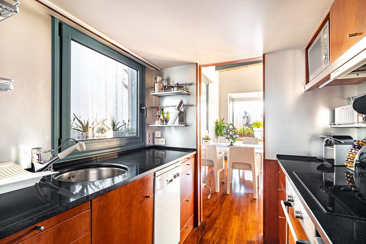 Laipni lūdzam mūsu augšstāva penthausā, kas ideāli atrodas mierīgā vietā vēsturiskā centra malā. Izbaudiet elpu aizraujošus skatus no privātās terases - mierīgu patvērumu atpūtai pēc Barselonas šarmu iepazīšanas. Šis klusais dzīvoklis mazgājas saules gaismā, un tajā ir pilnībā aprīkota virtuve, gaisa kondicionētājs un ātrgaitas internets jūsu komfortam. Tās centrālā atrašanās vieta ir tikai īsas pastaigas attālumā no Triumfa arkas, Ciutadella parka un El Bornas. Jūs gaida mierīgs mājoklis, kas atrodas tālu no mājām.