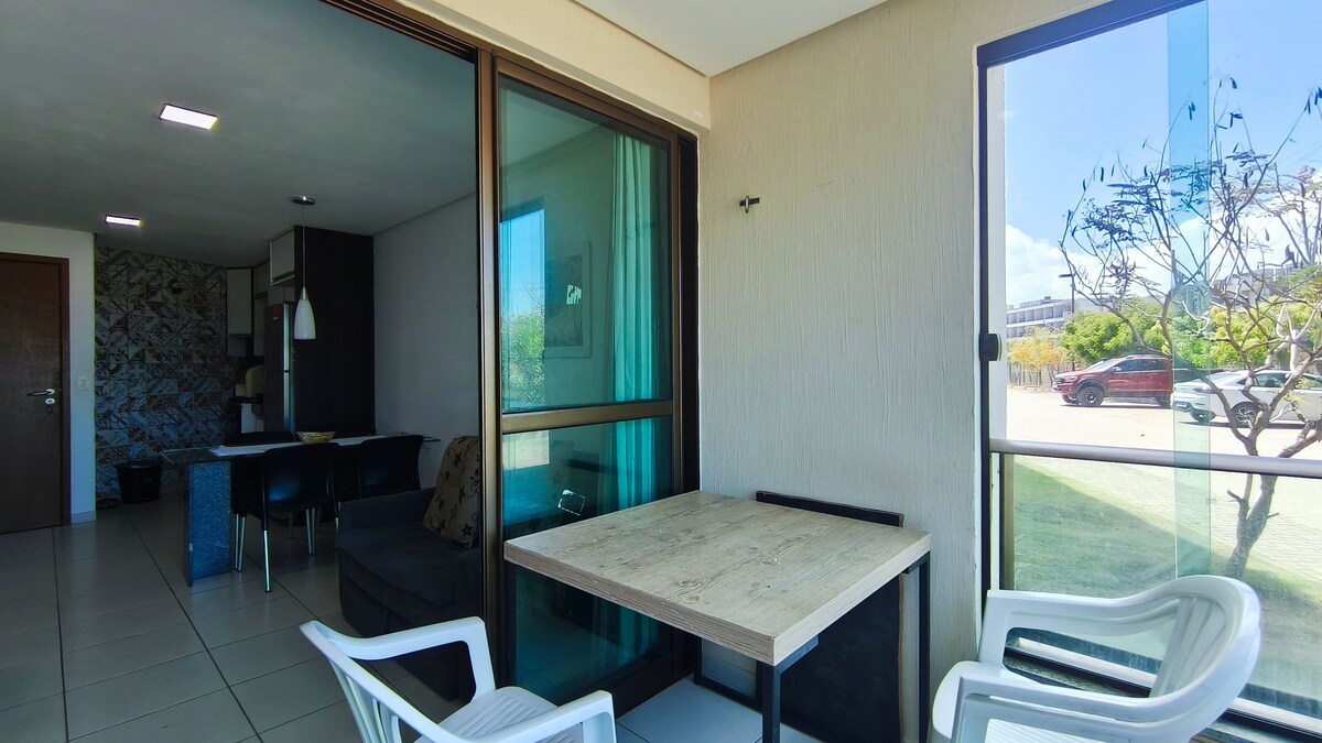 Este apartamento super equipado possui 2 suítes com camas queen, televisão em seus quartos como também na sala, além de ar condicionado em seus quartos e um ar condicionado central na sala. Com a vista para piscina e contemplando o mar de carneiros, você poderá preparar seu churrasco na varanda e abrir a cortina de vidro para deixar o vento entrar. Além de deixar suas bebidas gelando na cervejeira e assistir vários canais na tv. Tudo isso você encontra aqui. Além de um condomínio mega preparado.