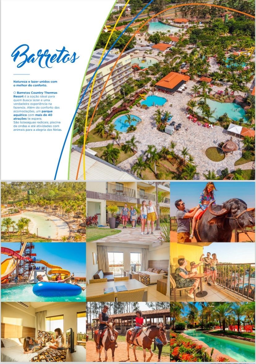 Datas disponíveis: 25/01 à 01/02 01/02 à 08/02 15/02 à 22/02 16/08 à 23/08 Parque aquático de alto padrão Piscinas climatizadas - Em Barretos é verão o ano todo Programação diária de lazer e recreação monitorada Restaurante, pizzaria e bar dentro do complexo Fazendinha temática - Passeio a cavalo, tirar leite da vaca, dar banho e montar na búfala, fazer queijo, segurar os animais, pescaria, passeio de trenzinho puxado por um trator, etc Arquitetura e decoração em estilo country sofisticado
