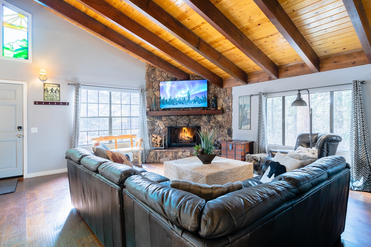 🛁 Private hot tub 🔥 Fireplace+fire pit 🎬 Outdoor movie screen 🐾 Fenced yard (pet 👍🏽) 📚 Loft balcony nook 🛏️ 2BR+loft sleeps 6: queen bed, bunk beds, air mattress 🏔️ THE MOUNTAIN MURDOCK is a remodeled retreat 11 min to slopes & close to Big Bear Lake 🍽️ Open kitchen, indoor fireplace, record player & exposed beams—perfect for couples, families & pets! ⭐️ Guests love: hot tub soaks, fireside chats, movie nights under the stars, sipping coffee in the loft, & vinyl vibes.