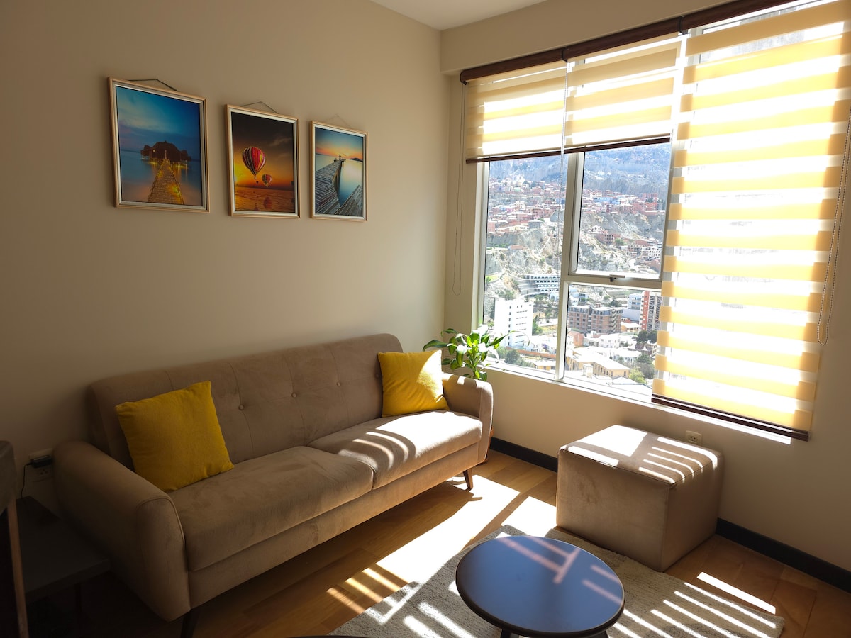 Atklājiet modernu dzīvokli ar augstu stāvu (21), kas apvieno komfortu, stilu un iespaidīgu skatu uz Lapasu un tās augstajiem kalniem. Ar augstas kvalitātes apdari un lielisku atrašanās vietu jūs izbaudīsiet pilsētu ar komfortu, jūtoties kā mājās un iedvesmojoties no unikālas vides gan dienā, gan naktī.