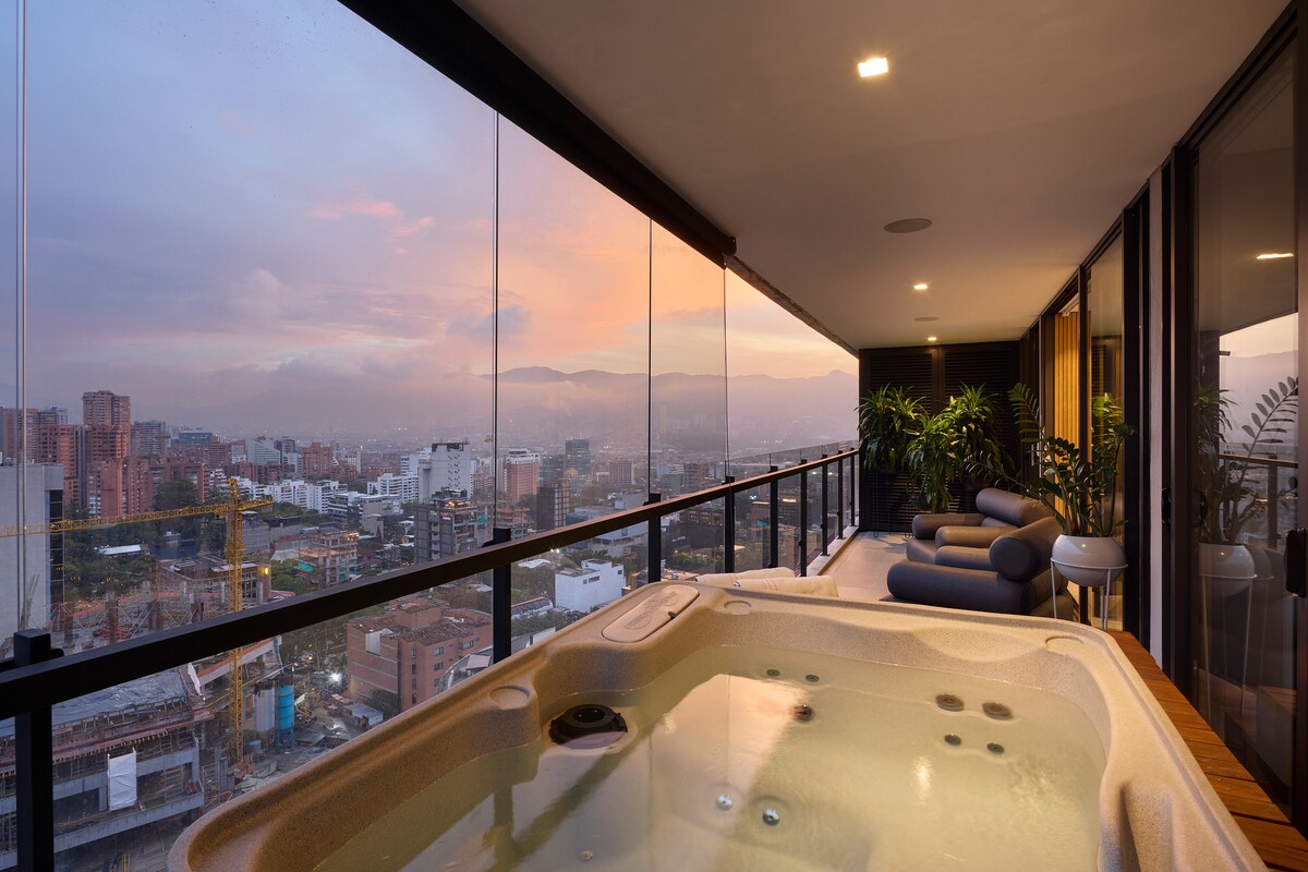 Premium klases dzīvoklis 21. stāvā El Poblado ar privātu džakuzi, panorāmas skatu uz pilsētu un kalniem. Atpūtieties uz balkona, izbaudiet komfortu ar gaisa kondicionētāju, strādājiet ar ātru Wi-Fi un īpašu darba vietu un izbaudiet 3 HD televizorus ar Netflix, pilnībā aprīkotu virtuvi, veļas mazgājamo mašīnu/žāvētāju un tējas/kafijas staciju. Piekļūstiet spa, sporta zālei, tvaika pirts telpai, baseinam, restorānam un kafejnīcai. Īss brauciens līdz Parques Lleras un Provenza – izcila augstceltņu atpūta luksusa, stila un komforta cienītājiem.
