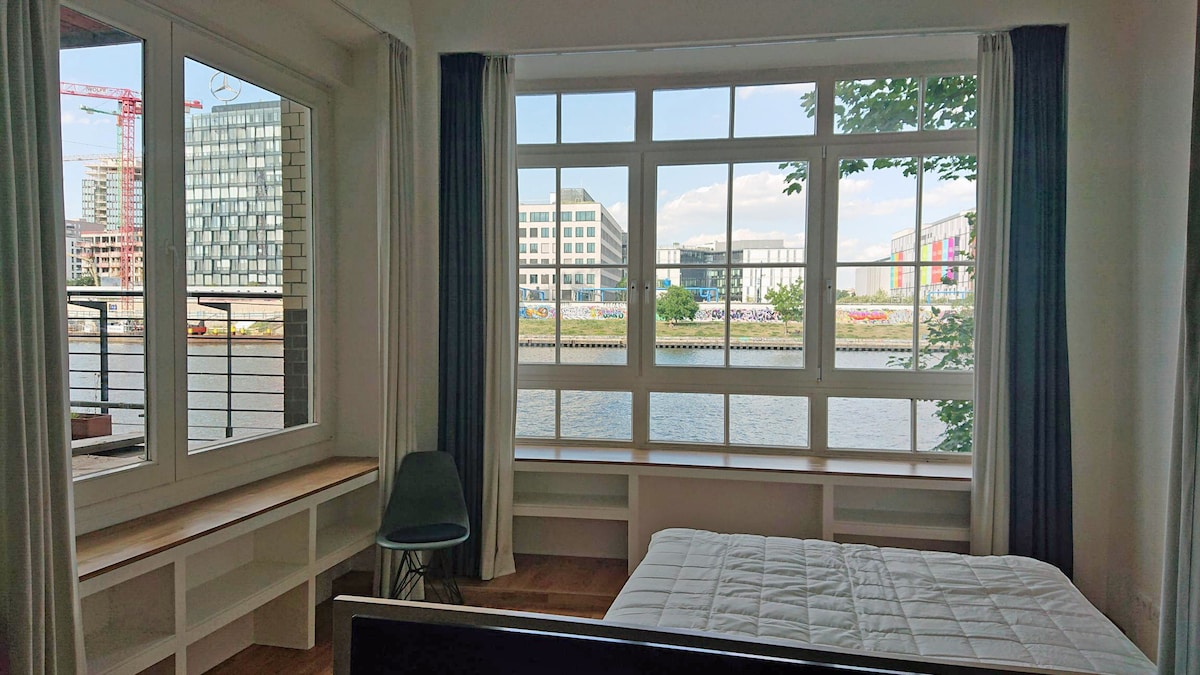 Ekskluzīvais bēniņš tieši Šprē krastos Kreuzbergā atrodas bijušajā ievārījuma rūpnīcā. Tā atrodas tieši Šprē krastos, un no tās paveras tiešs skats uz ūdeni. Plašajos balkonos 5. stāvā varat baudīt unikālus Berlīnes saullēktus un saulrietus. Skats uz Īstsaidas galeriju un Oberbauma tiltu ir unikāls. Dzīvoklī ir daudz vietas atpūtai, un tas ir ideāli piemērots sportistiem ar šūpolēm un privātu sporta zāli.