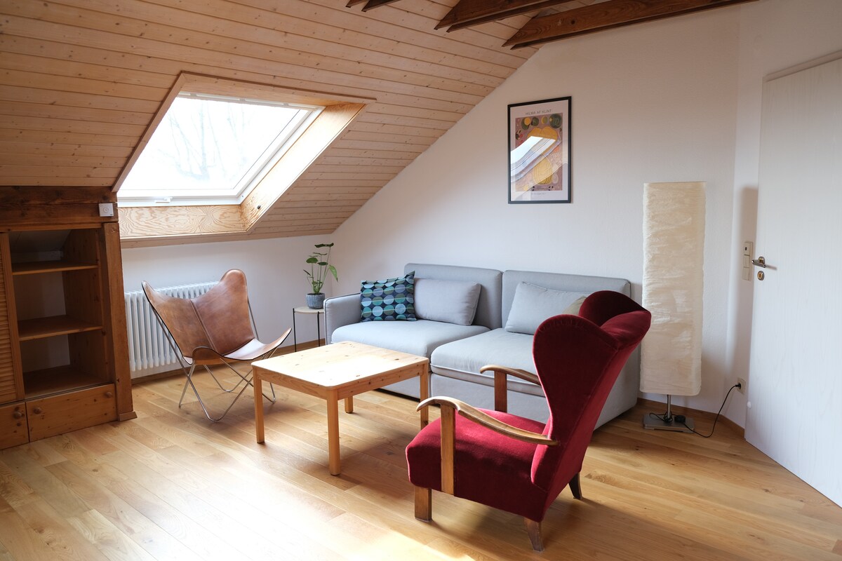 Mājīgs dzīvoklis bēniņos ar atsevišķu ieeju un kāpņu telpu, tīru vannas istabu, Tinykitchen un balkonu ar skatu uz Konstancas ezeru un Šveices Alpiem. Izbaudiet rīta tēju vai kafiju uz balkona un jūtieties kā atpūtā. Bezmaksas koplietošanas virtuves izmantošana ar pilnu aprīkojumu. Privāta autostāvvieta mājas priekšā, arī vieta treileriem un kemperiem. Mēs izīrējam istabu reizi nedēļā.