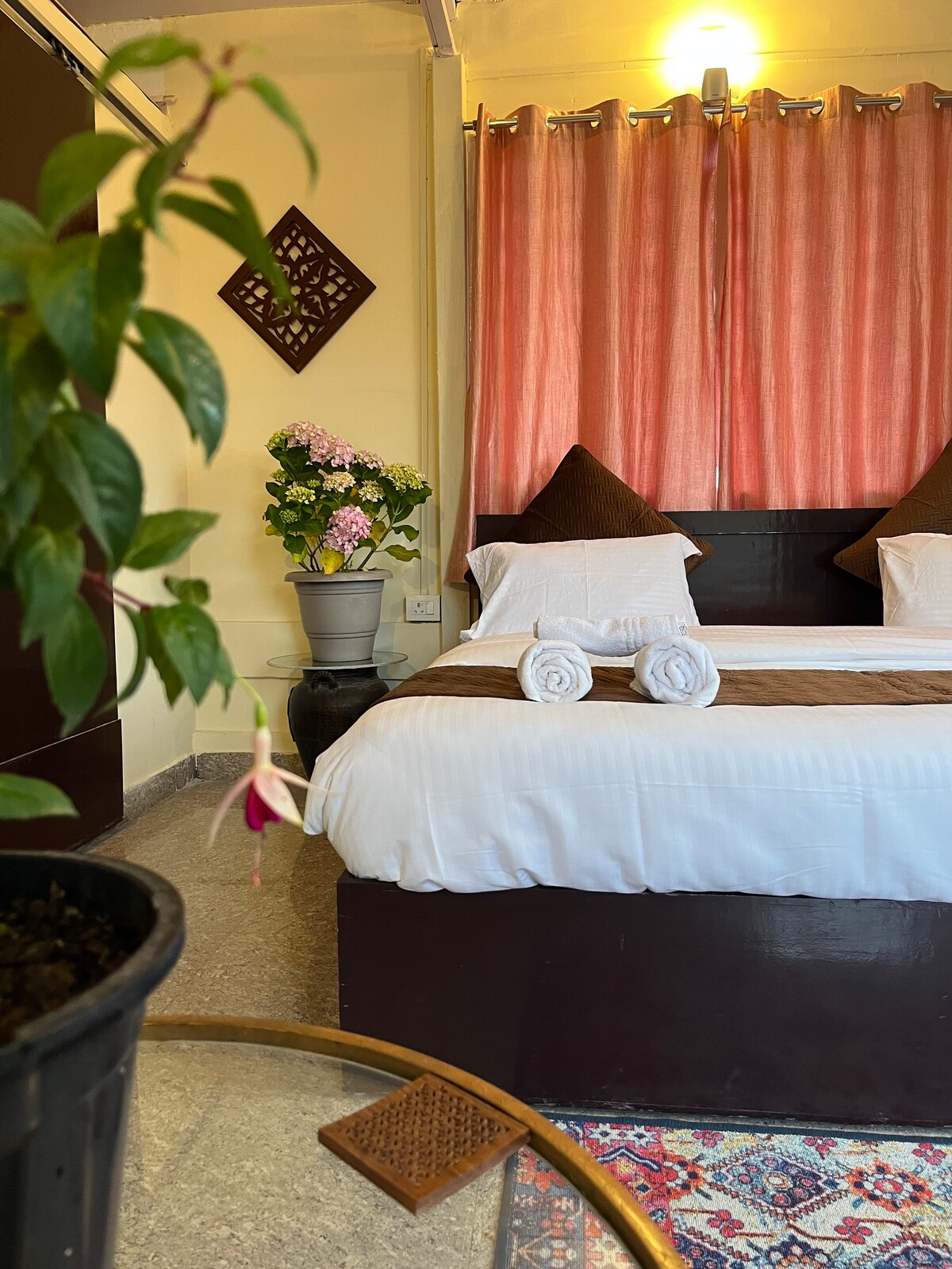 Laipni lūdzam mūsu mierīgajā Ivy Open-Plan Suite numurā, Sunrise Haven ar terasi, dārzu un kalnu/ieleju Muktešvarā. 🛜 Ātrgaitas Wi-Fi Rezerves 🔋 barošana Nodrošināta ☕️ elektriskā tējkanna 🍽️ Iekšējā virtuve ar a la carte maltītēm, ko pasniedz numurā vai pusdieno terasē 🚙 Autostāvvieta telpās ar vārtiem vai 10 m attālumā no ceļa puses no īpašuma ieejas Vairāk nekā 🌹100 augu šķirņu, lai atsvaidzinātu garastāvokli 🏔️ Skaidrā dienā no terases ir redzamas himalajiešu virsotnes Patika atmosfēra? Rezervējiet tūlīt un izbaudiet to
