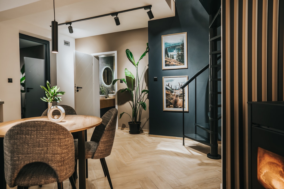 Divas koka mājas, kas apvieno vietējo stilu ar mūsdienīgumu un lauku raksturu. Atvērts visu gadu, katrs sadalīts divos neatkarīgos dzīvokļos (48 m² + 15 m² terase) ar atsevišķu ieeju, minivirtuvi, viesistabu, divām guļamistabām un vannasistabu. Visām guļamistabām ir balkons ar skatu uz skaisto dižskābaržu meža apkārtni vai tālo Połonin panorāmu. Mūsu jaunākajiem viesiem ir pieejami divi rotaļu laukumi ar batutiem.