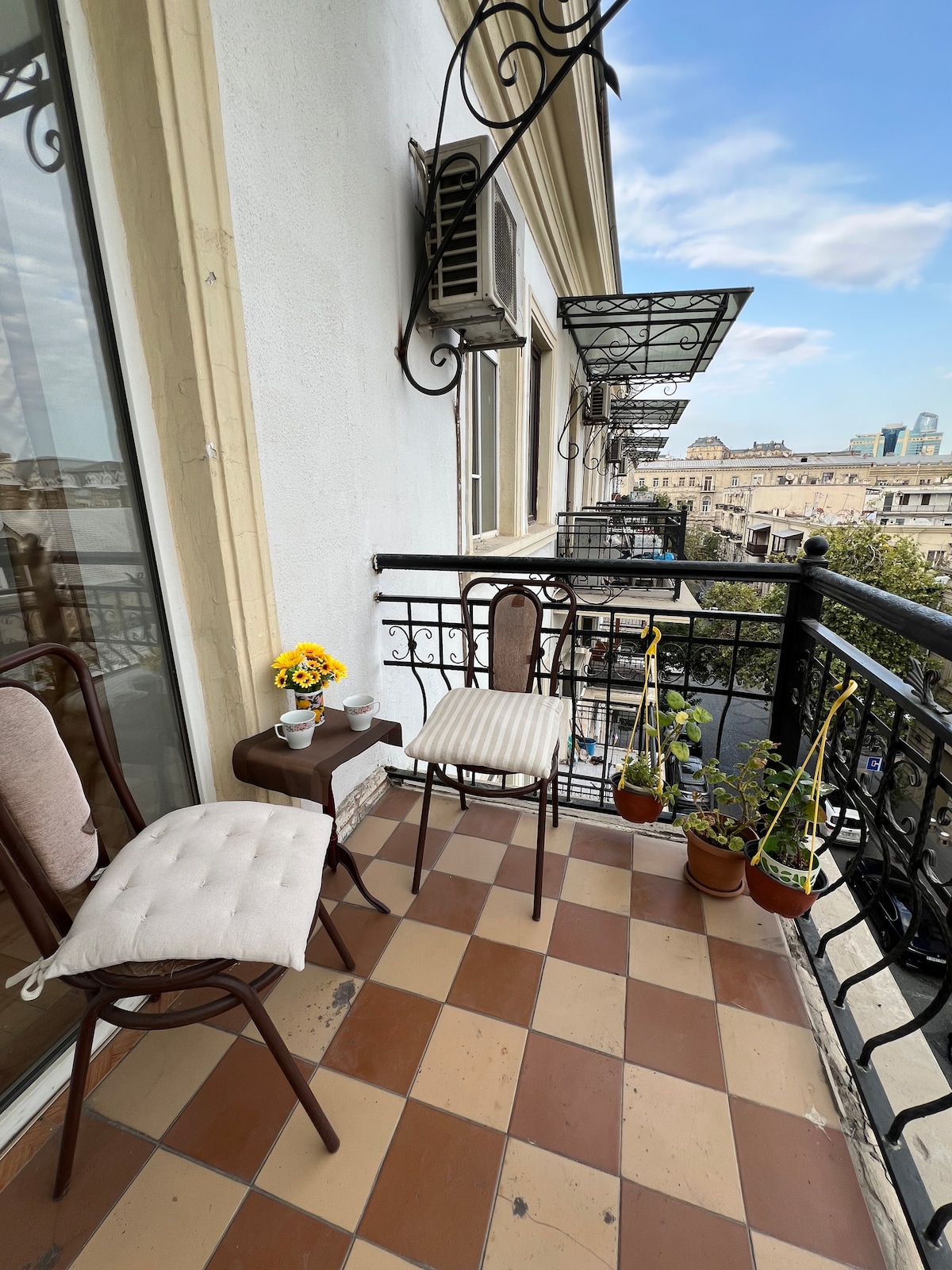 Квартира находится на 10 этаже 17-этажного элитного здания. В ней 3 изолированных комнаты - 2 спальные комнаты и один зал, централизованная система кондиционирования комнат, 2 отдельных балкона с видом на парк Офицеров и Цирк, 3 лифта, красивая панорама города, на первом этаже круглосуточный супермаркет BolMart. До ул.Торговой 20-25 минут пешком, до метро Низами 20 минут пешком, до ж/д вокзала - 15 минут. Общая площадь квартиры 120 кв. метров. Централизованная горячая вода в здании - постоянно.