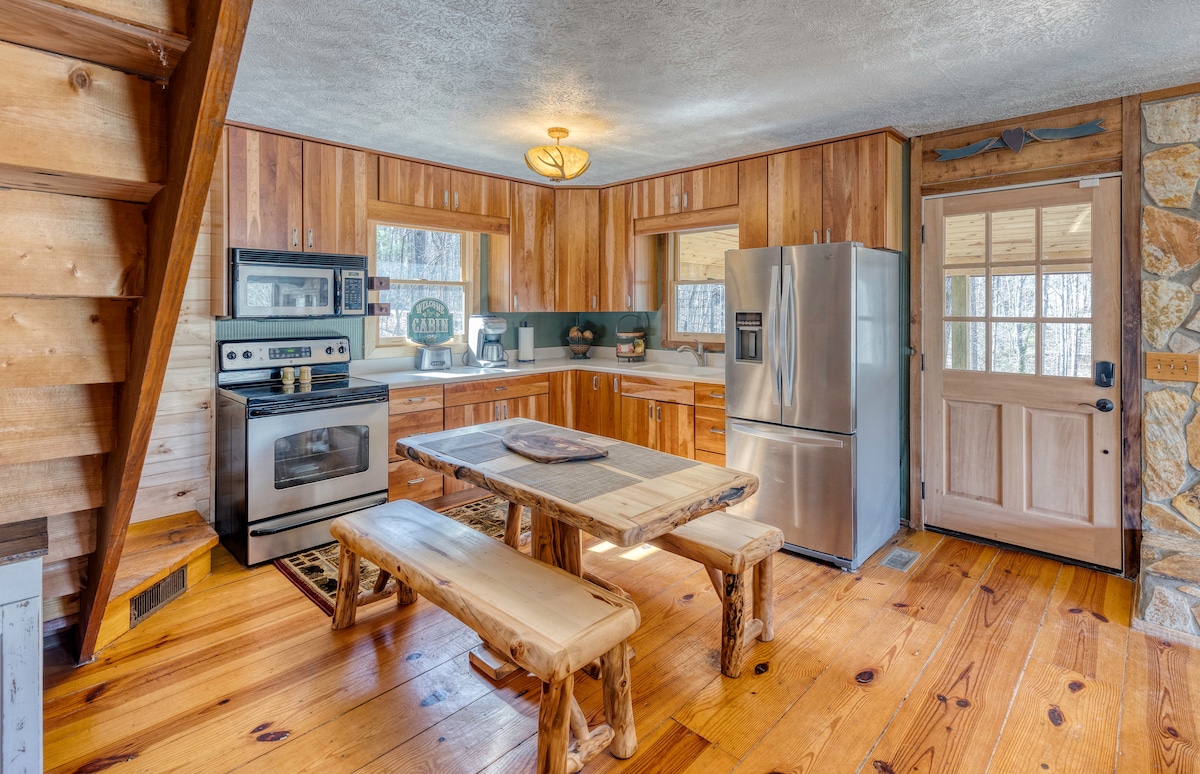 Dodieties uz mūsu mierīgo 2 guļamistabu, 2 vannu Blue Ridge kalnu namiņu. Izbaudiet elpu aizraujošus saulrieta skatus, burbuļvannu un mājīgu interjeru ar malkas kamīnu. Ideāli piemērots romantiskiem ceļojumiem vai piedzīvojumiem brīvā dabā ar pārgājienu takām, makšķerēšanu un citām vietām tuvumā. Šī atpūtas vieta, kas atrodas uz robežas starp Cherry Log un Blue Ridge, tikai dažu minūšu attālumā no Ellijay, apvieno komfortu ar dabu, lai baudītu patiesi neaizmirstamu uzturēšanos. Gilmer apgabala licences numurs: 004088, EXP 31/12/2025