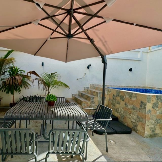 Atklājiet mieru mūsu elegantajā, divstāvu piekrastes villā ar divām mājīgām guļamistabām, divām modernām vannasistabām un ekskluzīvu autostāvvietu. Atrodoties drošā, aizvērtā anklāvā, jūs esat tikai mirkļi no burvīgām ēdināšanas iespējām un nesteidzīgas pastaigas līdz publiskajai pludmalei. Ērti novietota mūsu villa atrodas īsa 10-15 minūšu brauciena attālumā no lidostas un tikai 30-45 minūšu brauciena attālumā ar Uber no Santodomingo pilsētas centra.
