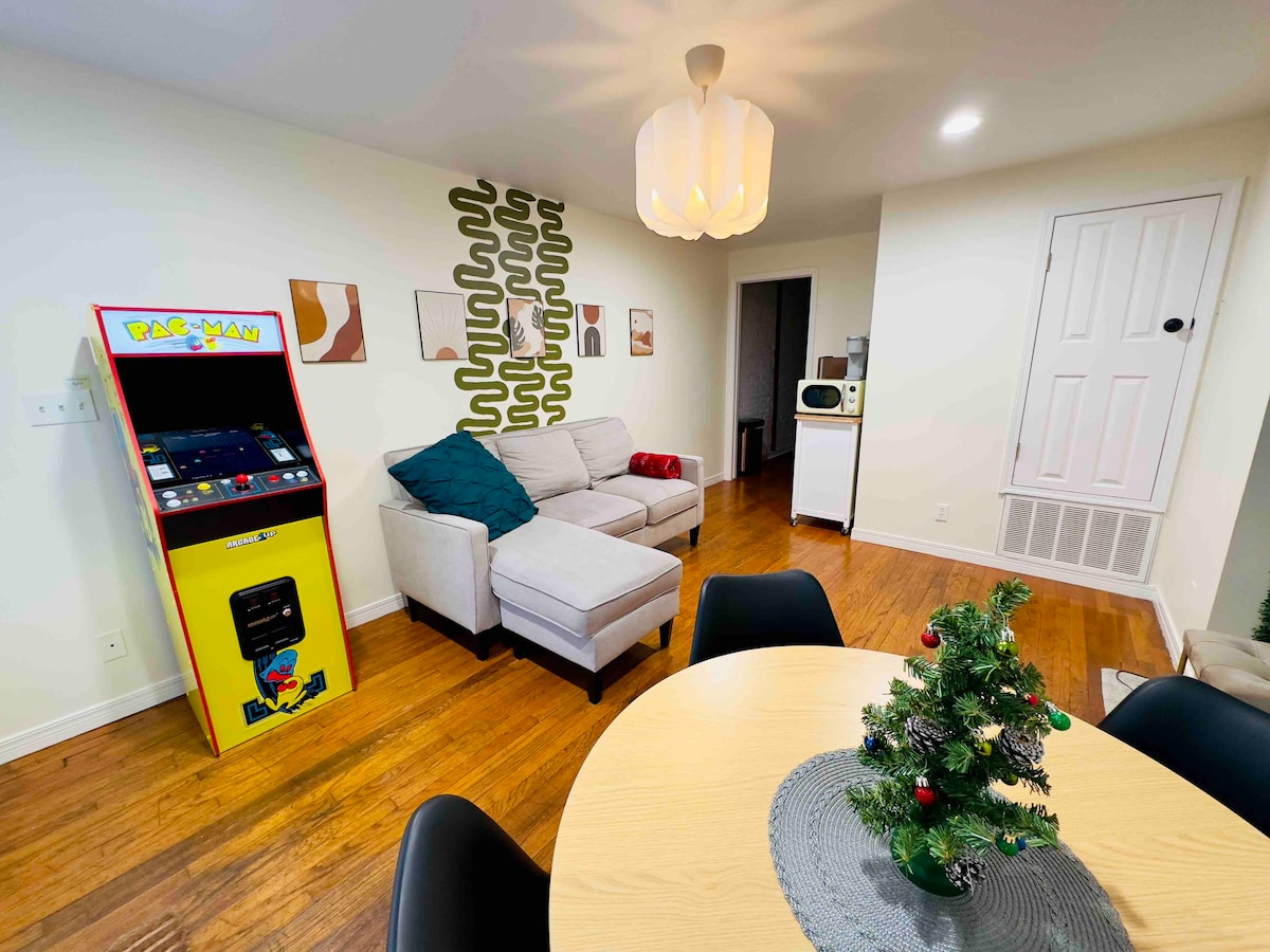 Cherry St Apt - BEZMAKSAS autostāvvieta ar segumu - viena autostāvvieta. Pastaigas attālumā līdz vairāk nekā 25 restorāniem, treniņu vietām, veikaliem un bāriem. BEZMAKSAS arkādes Pac-Man automāts. Pavisam jauna DIVGUĻAMĀ GULTA (KING). MĀKSLINIECISKĀ vide, ātrs Wi-Fi, 58collu viedtelevīzija, projektors filmu vakaram, galaktikas projektors (zvaigznes uz griestiem), klavieres, rotaļu komplekts un pilna izmēra augstais krēsls. 1,3 jūdzes no Utikas laukuma, 2,5 jūdžu attālumā no pulcēšanās vietas. TU, Tulsas štata gadatirgus, BOK, Koks, Kains. Neliela virtuves tehnika.