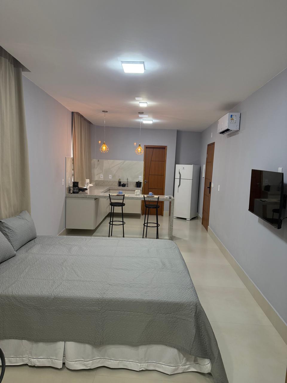 Abrace a simplicidade neste lugar tranquilo e bem-localizado. Estúdio com integração do quarto com a cozinha onde pode fazer um lanchinho assistindo televisão em banquetas altas com muito charme. Ideal para quem está a trabalho ou lazer. Próximo a mercado, farmácia, hospital. Bem no centro da cidade. Uma ótima opção para quem quer conhecer a nossa cidade.